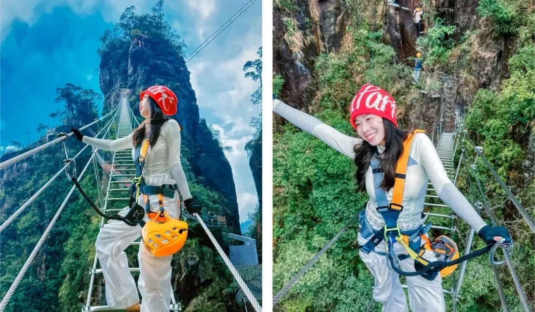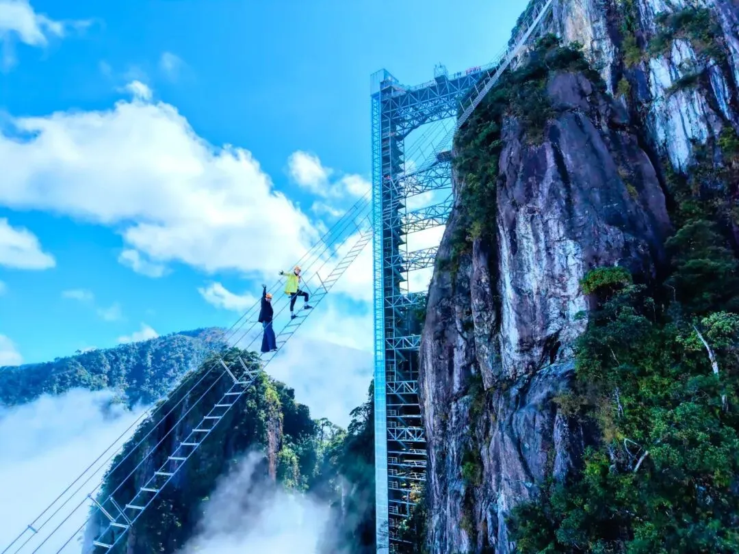 穿戴好装备,你就是岩壁上的蜘蛛侠。脚踩百米绝壁,手抓钢铁天路,当一回“峭壁行者”,转身是云海,低头是深渊,在莽山悬崖绝壁上云端漫步。