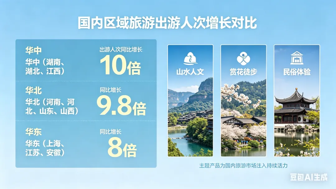 区域市场方面,华中、华东、华北热度持续飙升,其中华中区域(湖南、湖北、江西)出游人次同比增长10倍,华北区域(河南、河北、山东、山西)同比增长9.8倍,华东区域(上海、江苏、安徽)同比增长8倍。山水人文、赏花徒步、民俗体验等主题产品,为国内旅游市场注入持续活力。
