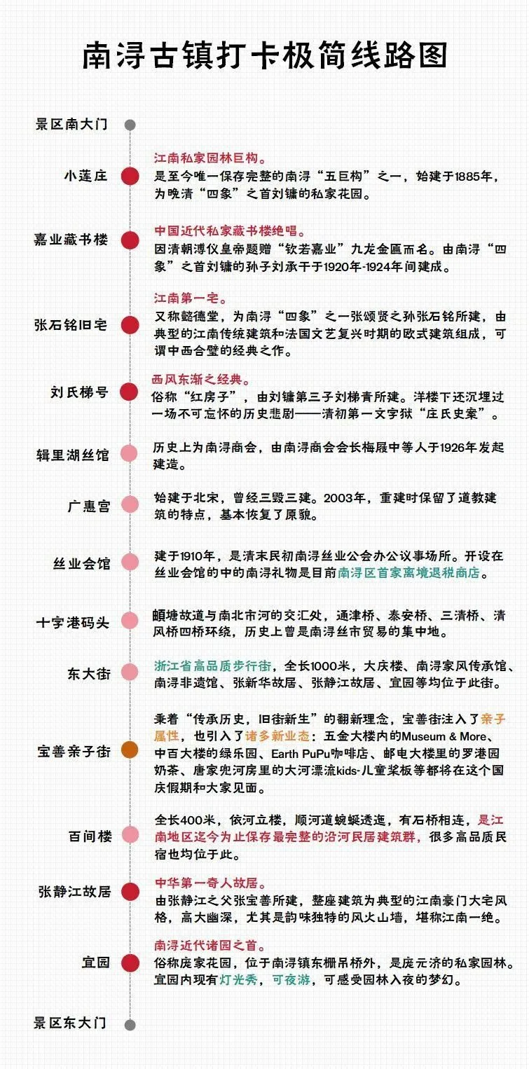 南浔古镇景区自2023年1月18日起向全球游客“永久免费开放古镇景区街区”,是继杭州西湖风景名胜区、绍兴鲁迅故里、台州天台山国清景区后,浙江省第四个实行免费政策的国家5A级景区。 南浔古镇位于太湖之滨,是大运河世界遗产的重要节点,历经千年沧桑,独具水乡之韵和中西合璧的建筑基底。走进古镇,穿过迂回曲折的街巷,既能入画江南小桥流水,又能体验古镇焕景新生,走过历史长河,穿越岁月繁华,来南浔古镇,寻找传统与现代的新平衡吧。 往下滑收藏 超详实的景点介绍 国庆假期 不如南浔