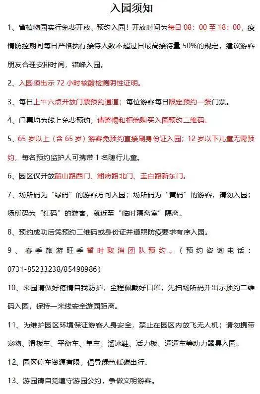 入园须知:省内游客须持有72小时内核酸检测阴性证明方可入园,从外省入(返)湘人员须出示48小时内核酸检测阴性证明,实行3天2检方可入园。