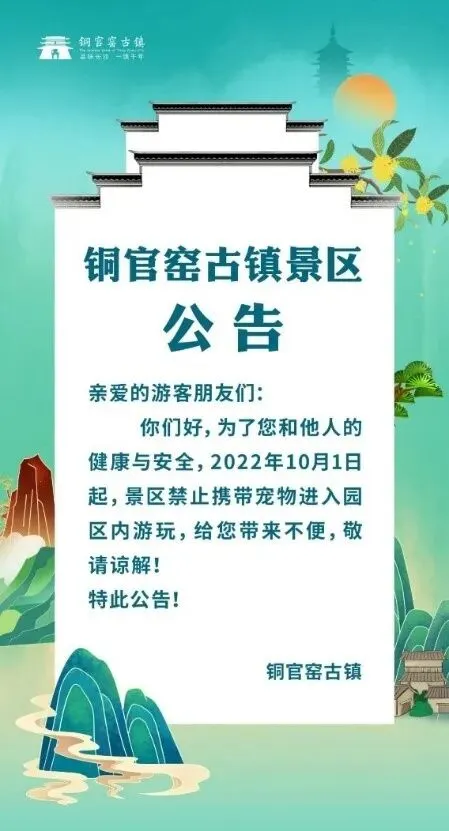 温馨提示:10月1日起,铜官窑古镇景区禁止携带宠物进入园区内游玩。