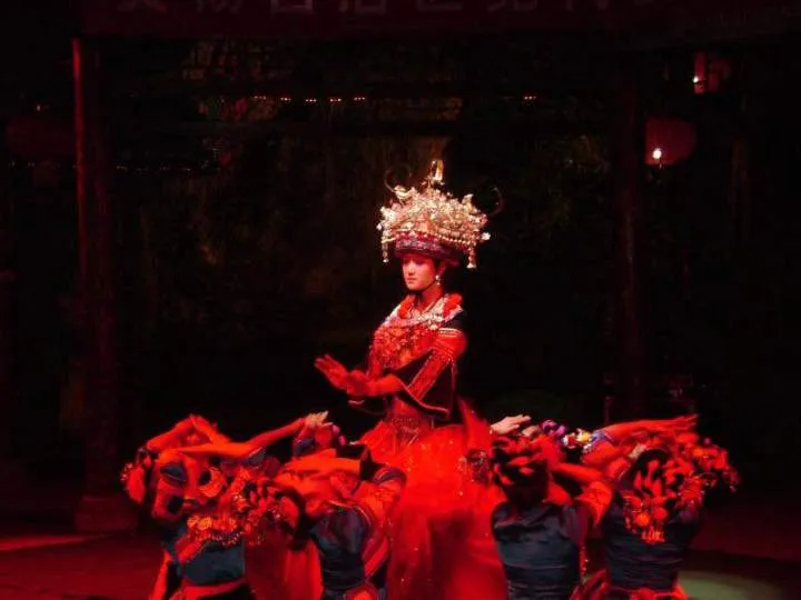 傍晚赴凤溪瑶寨——印象凤溪(瑶族风情晚会),(车程30分钟)游客一边品尝瑶寨本帮特有的簸箕宴(可选择油茶宴),一边观赏瑶族原生态芦笙长鼓舞、溜滴西、瑶嫁女等瑶族歌舞,游客还可以与当地本土演员互动,一起参与竹竿舞、舂白糍粑、背新娘等活动。