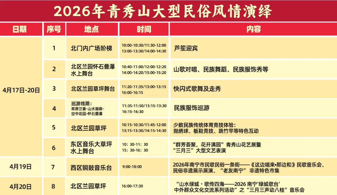 假期将至,不妨把一天交给青秀山。带上家人,约上好友,来赴这场花团锦簇、壮韵悠扬的春日之约。我们在青秀山,等你踏歌而来。
