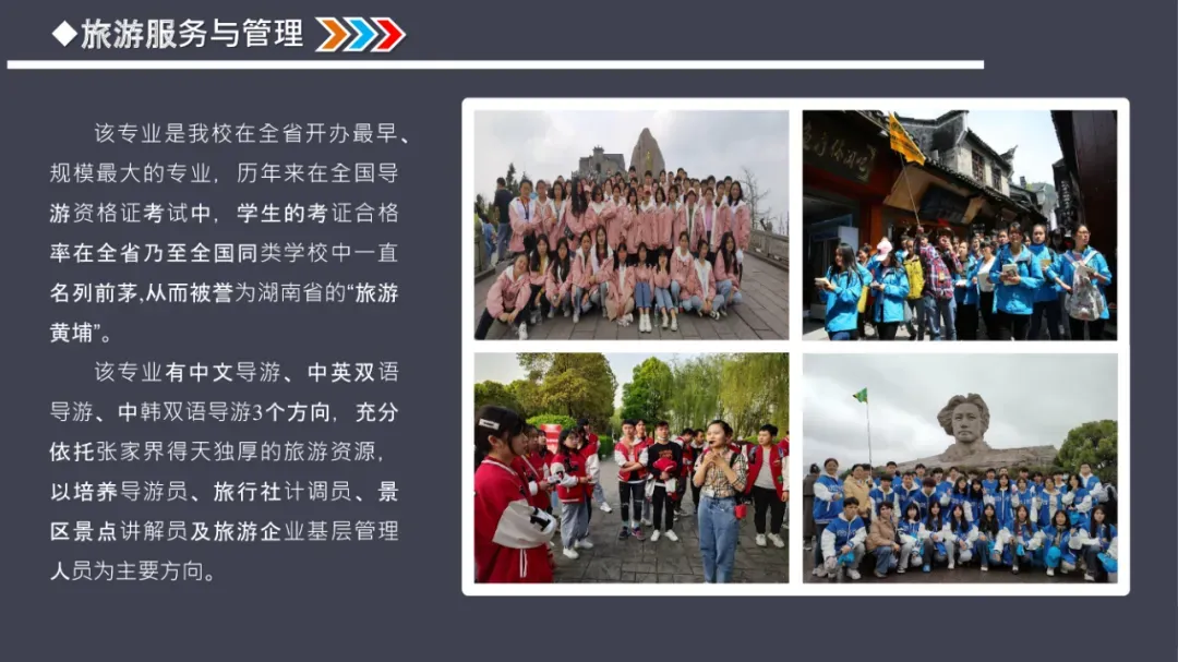 您现在的位置是:首页 > 国内旅游目的推荐 > 正文 国内旅游目的推荐 2026年张家界旅游学校招生简章|报名指南 admin2026年04月16日 16:39:42国内旅游目的推荐1 2026年张家界旅游学校招生简章|报名指南张家界旅游学校创办于1983年,坐落于张家界市永定区,是一所公办重点中等职业学校。学校紧邻永定大道,教学设施齐全,可容纳5000名学生就读。学校现有教职工200余人,开设旅游服务与管理、中餐烹饪、高星级饭店运营与管理、幼儿保育、计算机应用等7个特色专业及对口升学班。 转载请说明来源于"旅荐网",部分内容转载自网络,如有侵权请联系qlwl@foxmail.com删除 本文地址:https://www.15386.cn/post/155586.html 上一篇 昆明周边游:寻甸景点攻略 下一篇 旅游行业导游乱象、强制消费等问题防范指南 相关文章 五指山企业注意!五指山市促进旅游消费奖励措施申报工作已开启!速来申报 武宣三月三旅游攻略|以山歌为媒,赴山水之约,解锁千年古县的春日浪漫! 王屋山景区旅游攻略 重庆四天三晚旅游攻略(第一天) 西藏以西,天上阿里,2026年冈仁波齐旅行攻略 江西省博预约攻略——五一旅游好去处 郑州到重渡沟景区游玩旅游攻略 乡镇旅游指南|枧坝镇山水溶洞+人文古村一日游攻略 “花满宁州”田园文化艺术旅游周活动旅游攻略 一份来自宁县融媒体中心的保姆级游玩 云南旅游全攻略:从春城到雪山,这篇带你玩转七彩云南?为什么选择云南? 发表评论 取消回复 评论列表 这篇文章还没有收到评论,赶紧来抢沙发吧~