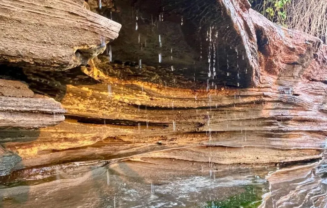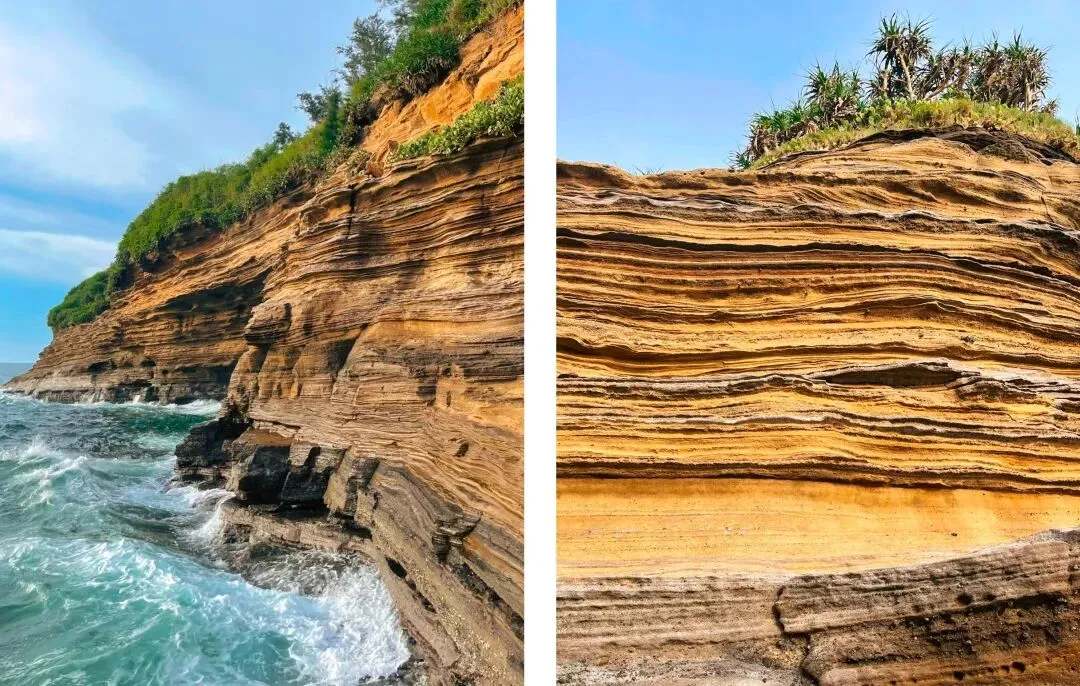 当然,如果你想来溜娃,记得带上小铲子,小朋友就能在海边的沙滩上玩一整天。 滴水丹屏 滴水丹屏位于涠洲岛滴水村南岸,西面环海,由于崖壁上层间裂隙常年滴水,形成“珠帘垂挂”的景观,故名“滴水丹屏”。
