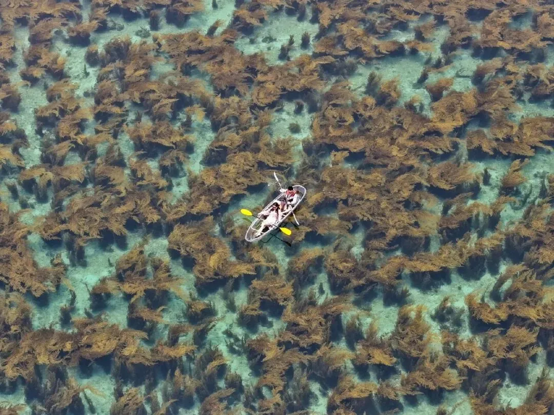 随着玻璃海出现的还有海底森林,透过海面看见的一簇簇马尾藻,划着小船前行,仿佛置身偌大的海底森林。
