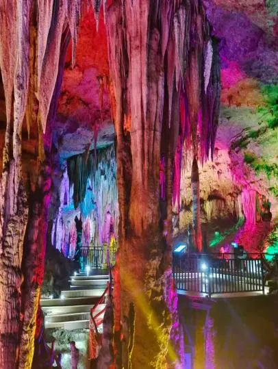 走进洞内,钟乳石、石笋千姿百态,在灯光映衬下宛如仙境,形态各异的怪石仿佛被赋予了灵气,让人不禁感叹大自然的鬼斧神工。景区内的观景台更是不能错过,站在高处远眺,群山连绵、田园风光尽收眼底,将山间美景一览无余,溶洞的奇幻与山间的壮阔完美融合,视觉体验直接拉满。