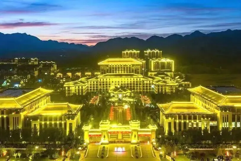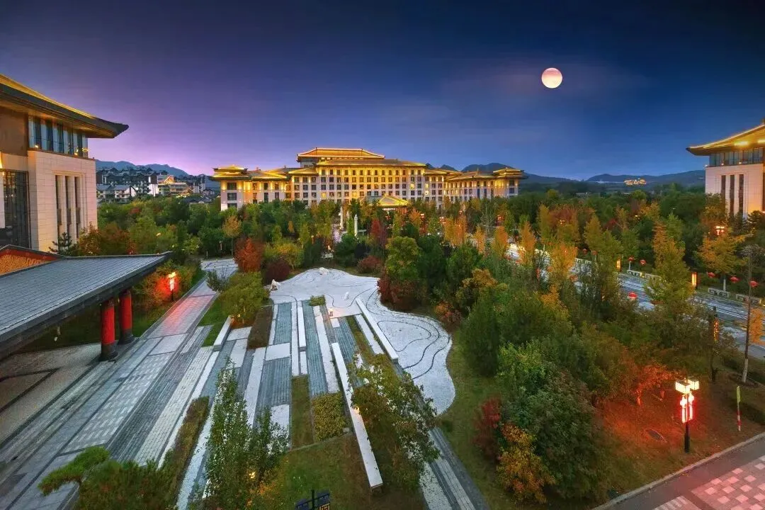 夜幕降临,华灯初上,度假区的汉唐建筑、园林回廊、湖畔栈道都被暖黄灯光点亮,璀璨灯火与夜色、山水相融,勾勒出温柔又大气的绝美轮廓。