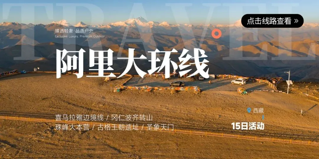 用15天,走完一条完整的阿里大环线。沿途尽览阿里及周边标志性风光,在这条线路上,可以远观珠穆朗玛峰、冈仁波齐、干城章嘉峰、洛子峰、希夏邦马峰、纳木那尼峰、库拉岗日等雪山,享受一场极致的雪山盛宴;徒步冈仁波齐,深入感受藏地独有的民族文化;在辽阔寂静的无人区,奔赴一场自由而壮阔的高原远行。