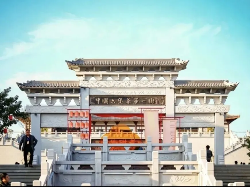 仿古建筑错落有致,茶铺、茶器店、非遗工坊林立。逛茶叶集市,看传统制茶展示,打卡茶主题雕塑,夜晚赏灯光秀。