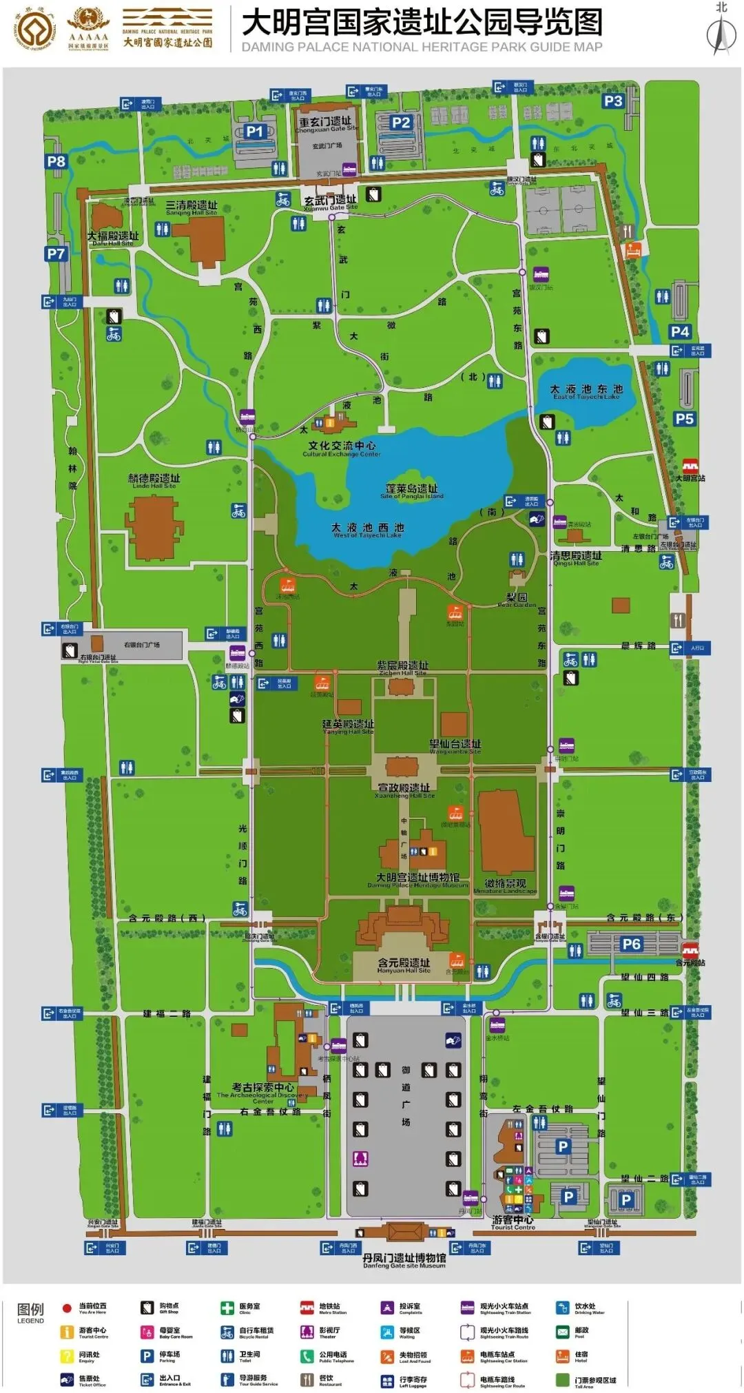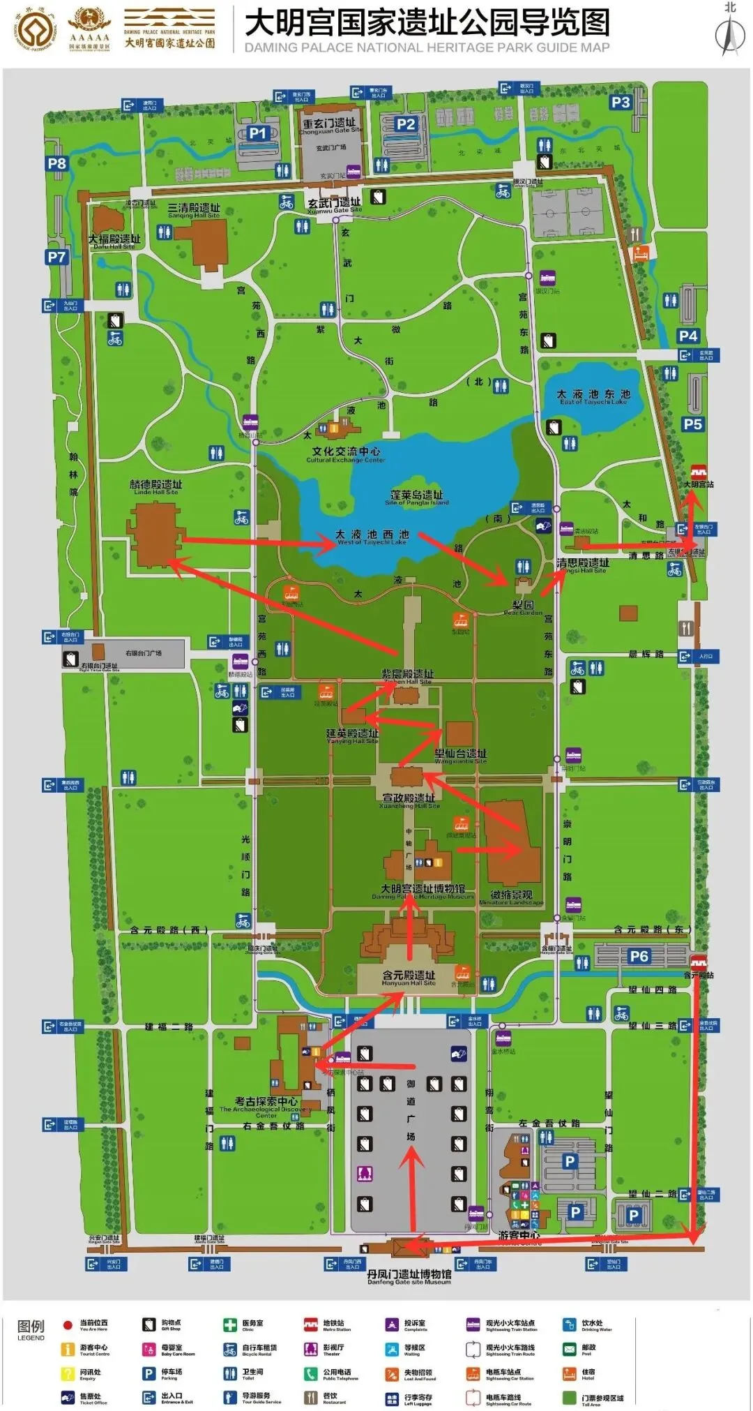 含元殿地铁站→丹凤门遗址博物馆→御道广场→考古探索中心→含元殿遗址→大明宫遗址博物馆→微缩景观→宣政殿遗址→望仙台遗址→紫宸殿遗址→建英殿遗址→麟德殿遗址→太液池→梨园→清思殿遗址→大明宫地铁站