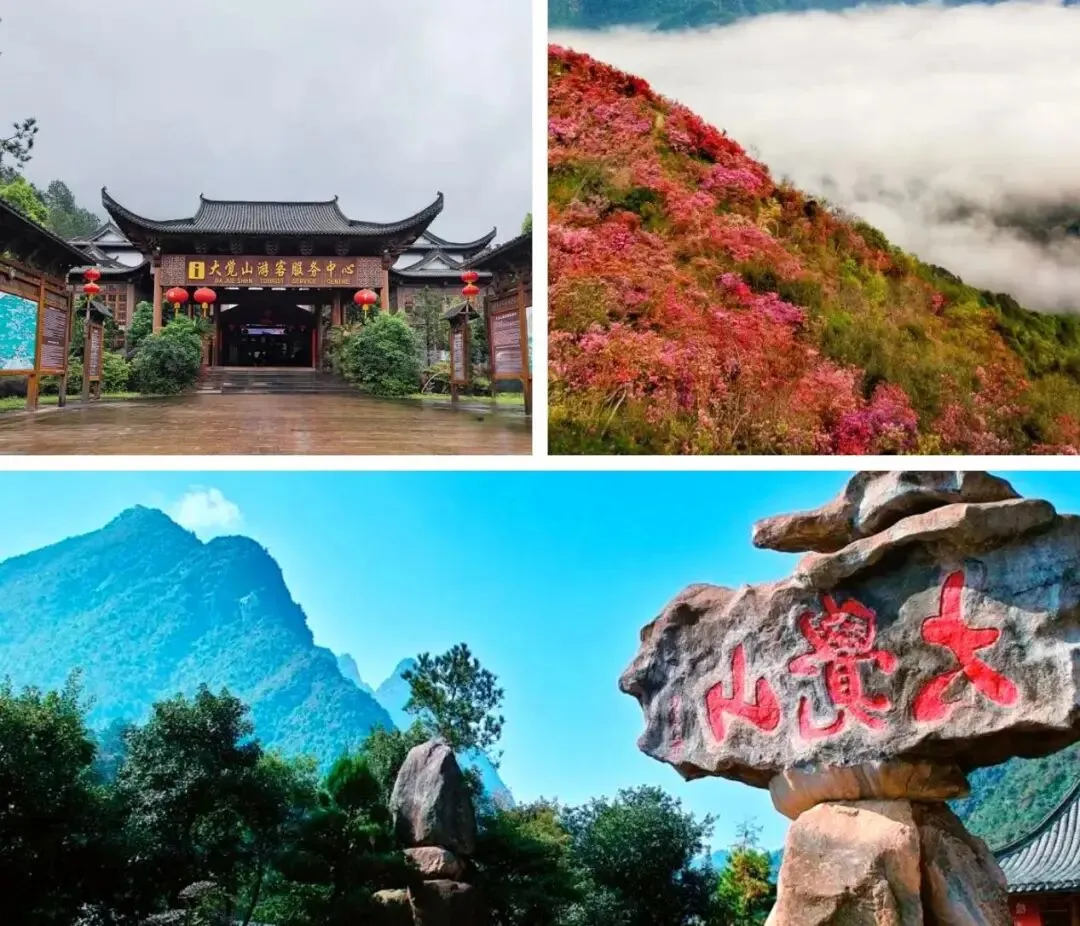 午后赴大觉山,禅寺静卧山林,钟声悠远。春日杜鹃漫山点缀,登观景台可俯瞰溪水流过阡陌田园。