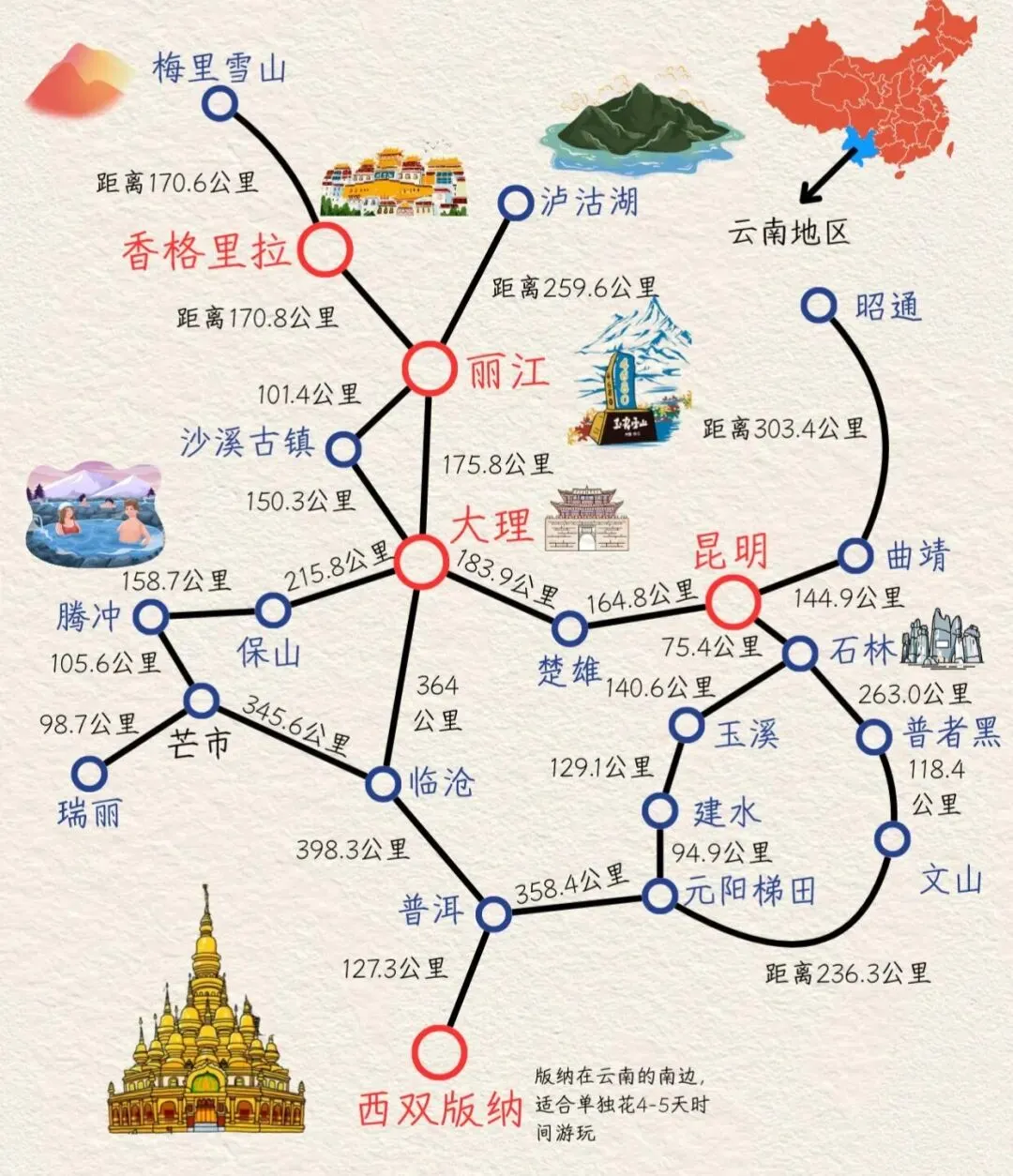 方案四:昆明→大理→丽江→西双版纳(10天南北全景线)