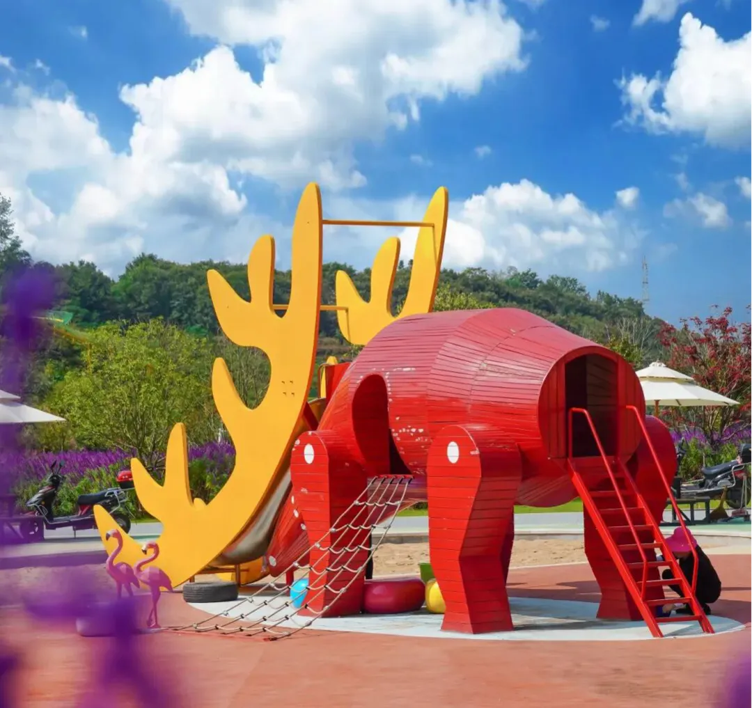 依托原有老林场的地形,顺势打造出错落有致的梯田式花海。花海依山势层层叠叠,从高处俯瞰,就像是自然在山谷间铺开的“调色盘”。不同季节主打的花卉各有风情。春季和初夏,鸢尾、杜鹃、天人菊等各类花卉竞相开放,色彩斑斓。马鞭草是这里的“明星花卉”,通常在6月至8月盛放。盛开时,整片山谷如同披上了一袭浪漫的“紫色夏衣”,不输普罗旺斯的氛围感。