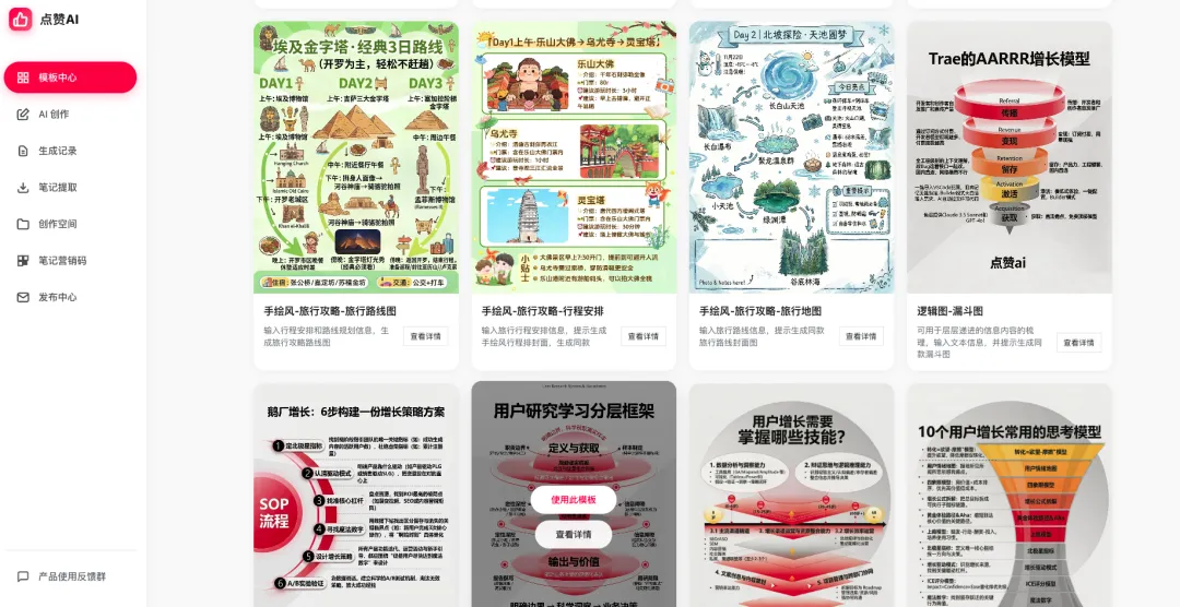[1] 选中模板框架进入点赞AI“模板中心”,直接调用已经设定好的【三栏手绘行程单】版式。