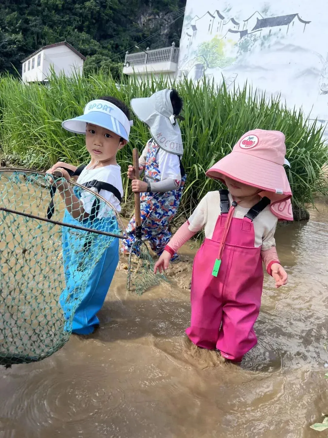 使用简易渔网、竹篓等工具在稻田中捕捉稻花鱼(当地特色小鱼)