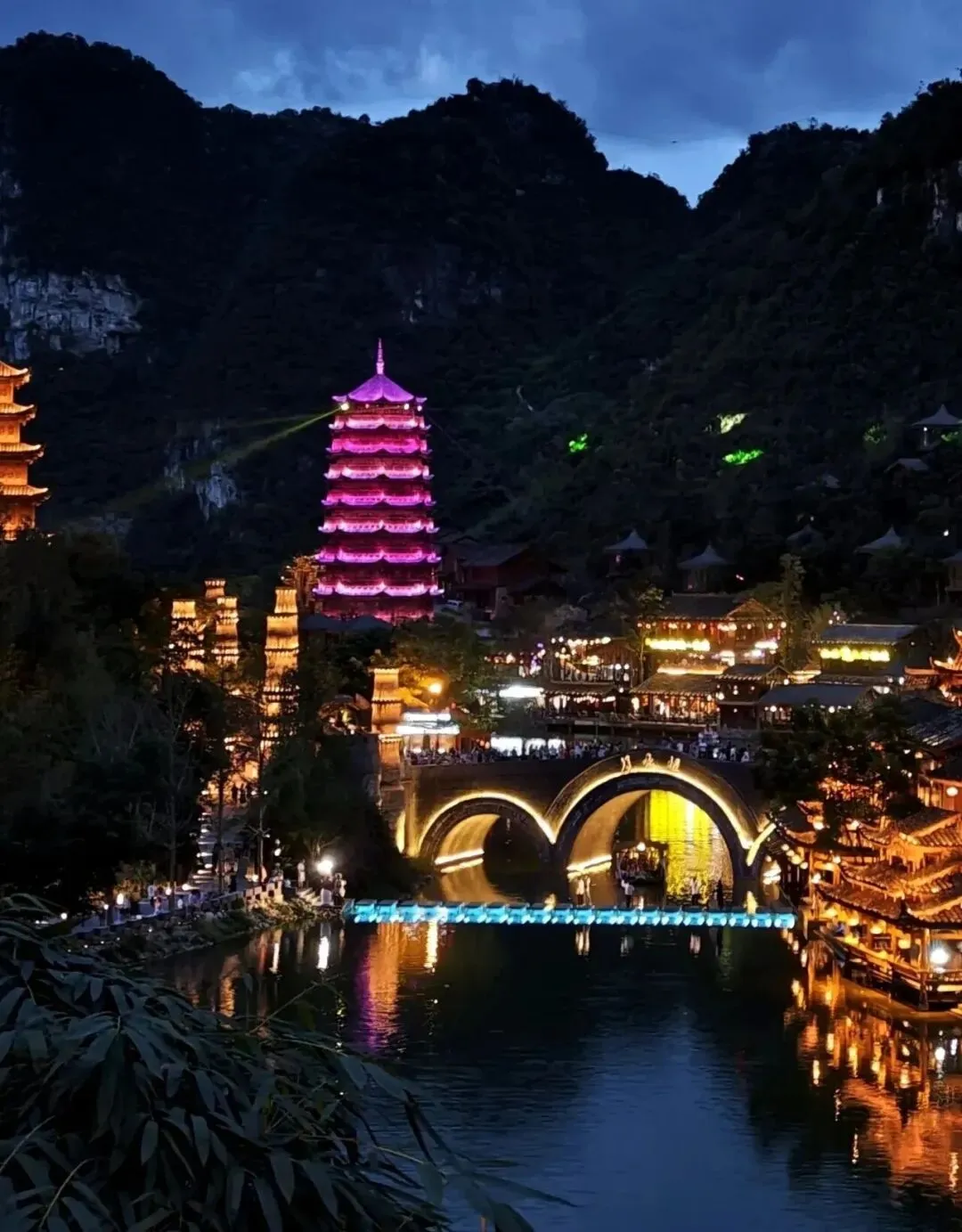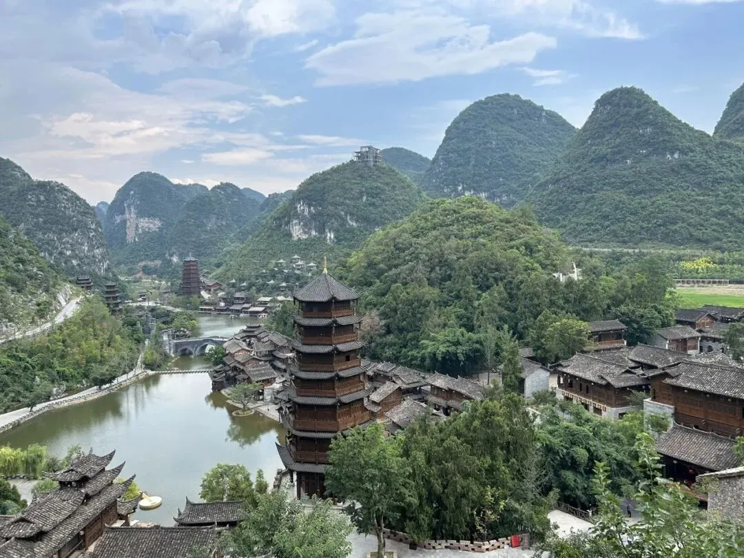 峰林布依:是兴义新晋布依文化主题景区,以 “山水布依・诗意栖居” 为核,600 余栋布依吊脚楼依山傍水,与峰林相融。浪哨湖、月亮桥、九重塔为核心地标,白天湖光山色、吊脚楼错落,似水墨长卷;夜晚灯火璀璨,吊脚楼群流光溢彩,被誉为 “贵州千灯古镇”。景区非遗街汇聚蜡染、枫香染、古法造纸等技艺,可亲手体验。每晚有打铁花、八音坐唱等民俗表演,布依风情街、勒尤小镇烟火浓郁,是沉浸式感受峰林风光与布依族文化、日夜皆美的文旅新地标。