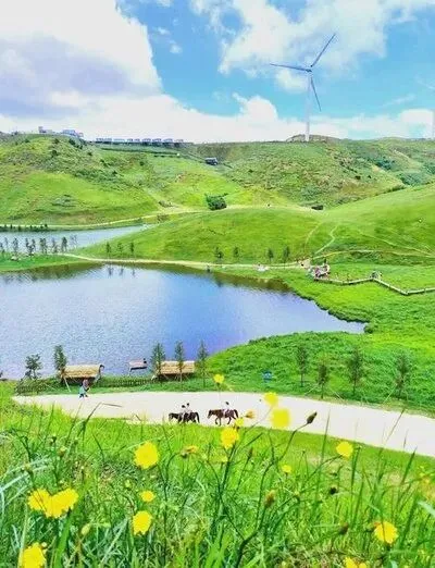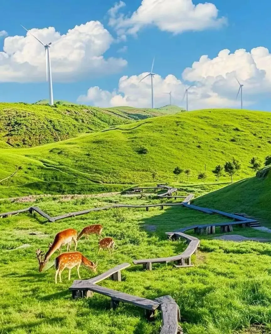 海拔 1314 米的仰天湖,草甸如碧毯铺向天际,风车轻转、湖水澄澈。风裹着青草香,牛羊漫步山野,把疲惫揉进云间,每一帧都是治愈的童话。