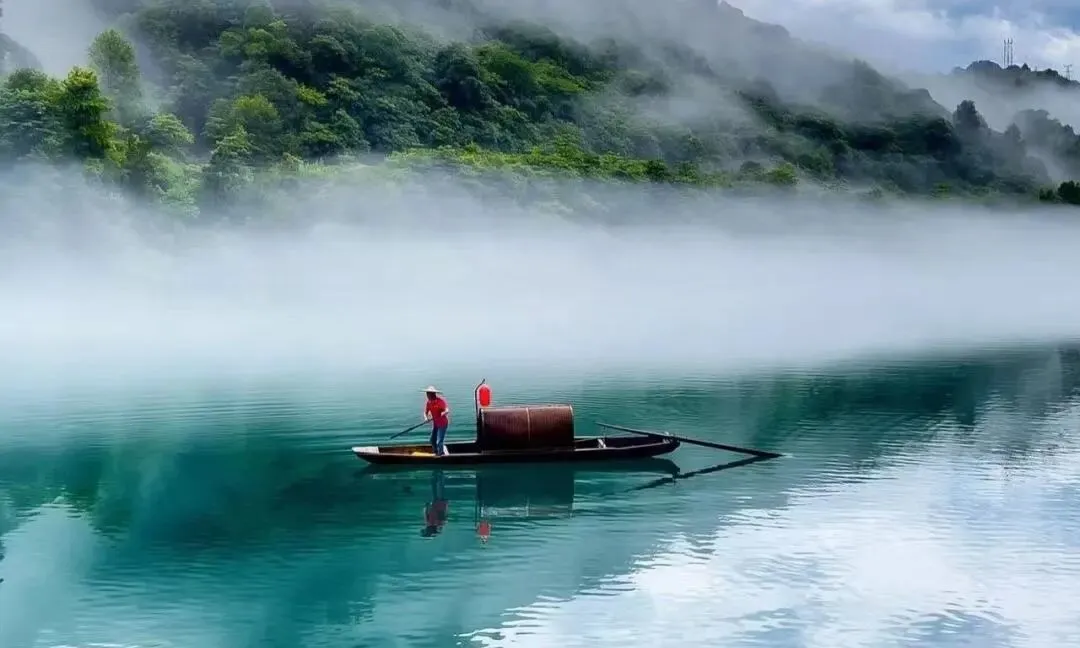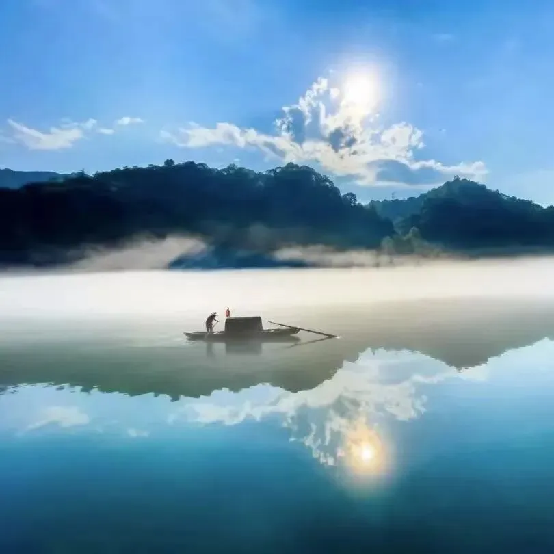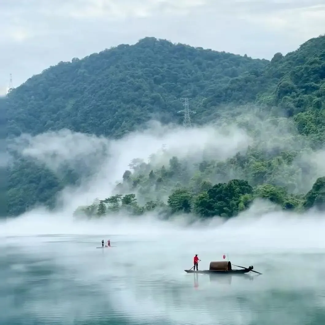 郴州东江湖,晨雾漫过小东江,轻纱覆碧水,渔夫轻撒网,青山如黛、湖面如镜,活脱脱一幅流动的水墨长卷,人间天上一湖水。