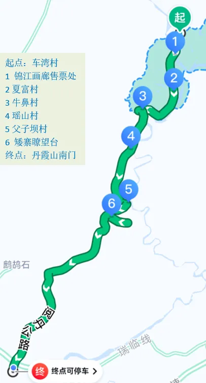 游览完丹霞山景区后,我们走阅丹公路前往韶关市区,一路自驾,边走边玩。导航时设置了几个中间经过点(车湾村-夏富村-牛鼻村-瑶山村-父子坝村-矮寨瞭望台-丹霞山南门),并一直沿着阅丹公路的道路划线行驶。