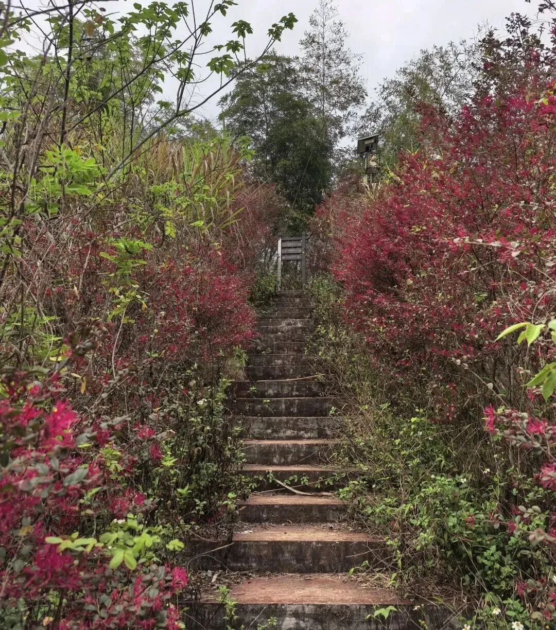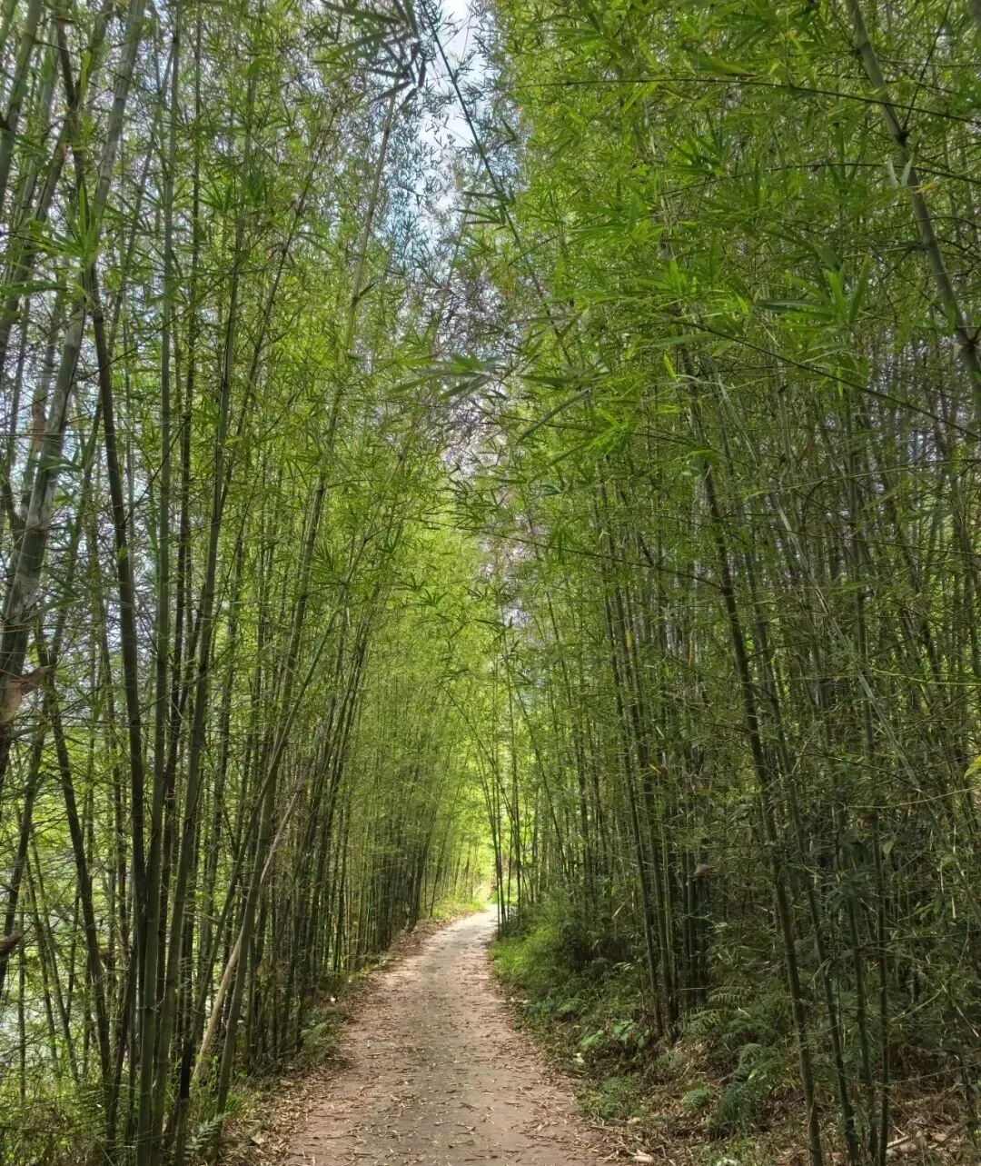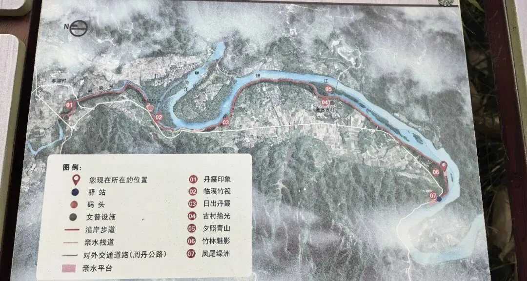 过夏富村不远有一个很大的环丹霞山碧道停车场(位置在碧道导览图标注的景点6和景点7之间)。我们停好车,先穿过200米凤尾竹林向前走到碧道终点(景点7),又往回沿着锦江走了大约1公里(景点5和景点6之间),随后打道回府,返回停车场。