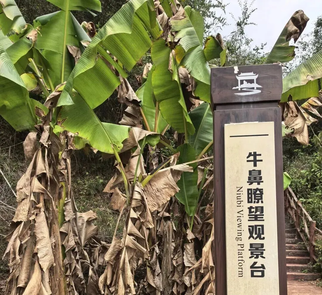 牛鼻村的东北是丹霞山,东南是韶石山,西面是大石山,锦江绕着村子形成一个长长的U字形半岛,半岛形状如同一只牛鼻子,村名由此而定。牛鼻桥是进入牛鼻村的唯一道路,勉强能通过一辆车。过牛鼻桥不远的丁字路口有停车场,旁边是锦江画廊水上游8号线的终点码头。在牛鼻村对面的小山上有一个牛鼻瞭望观景台,可俯瞰牛鼻嵌入锦江的美景,非常壮观。还有一个童子拜观音观景点,可近观著名的观音石,在牛鼻桥头位置观览,效果最佳。