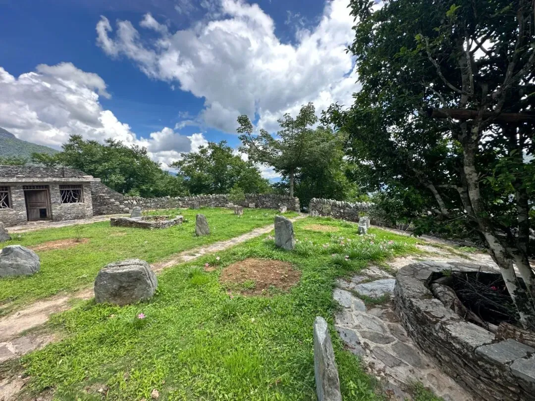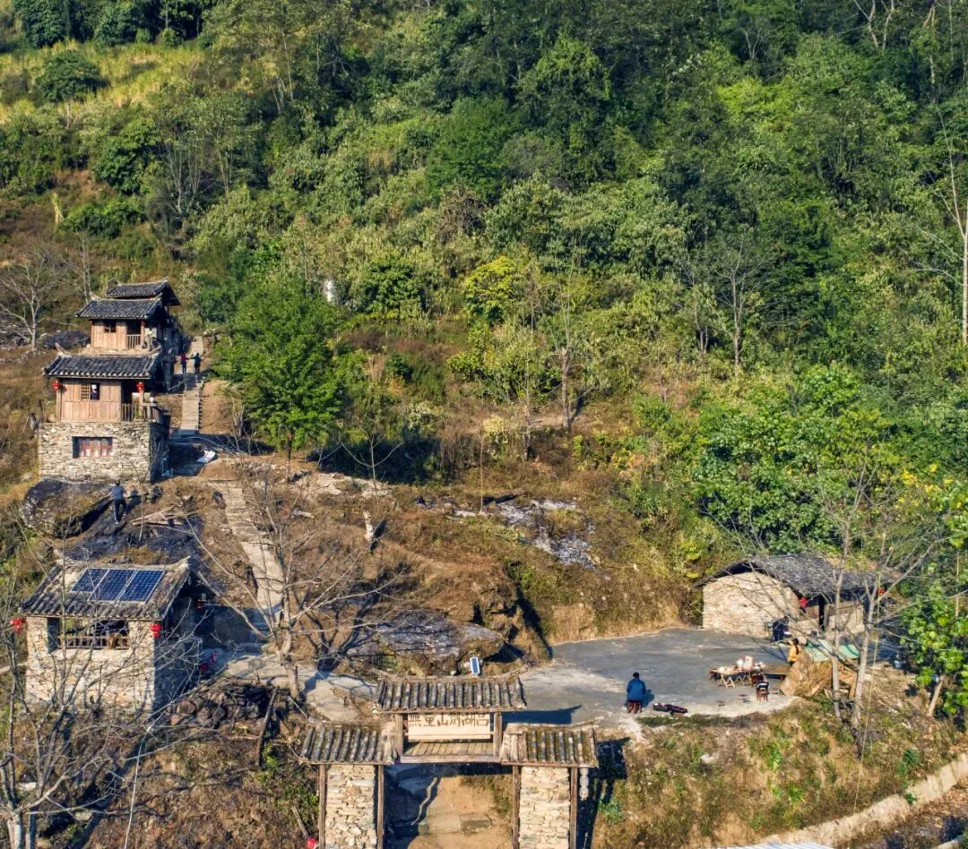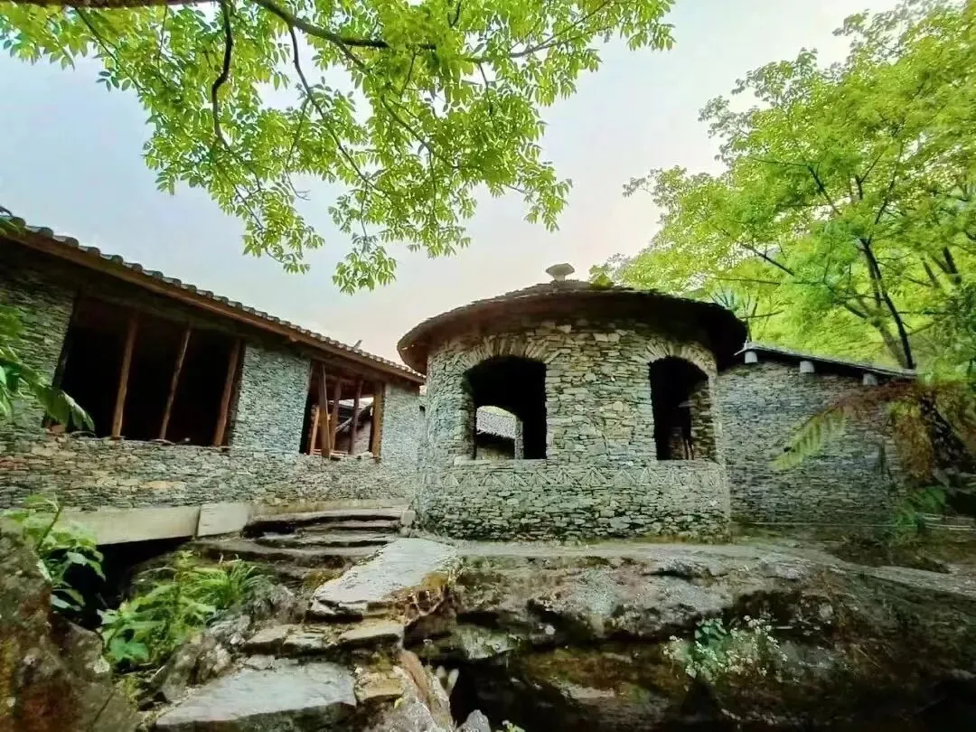 青石墙翘檐坡屋顶的传统建筑