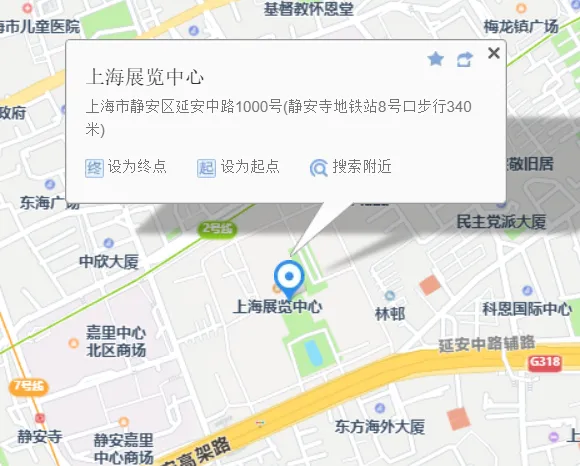 地铁2、7、14号线至静安寺站,8号口出,步行500米到达展馆