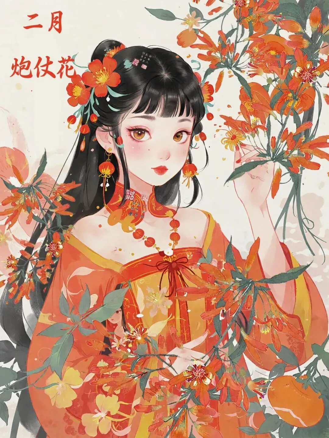 二月迎新春,除夕正月,团圆喜庆,炮仗歌舞,故得二月令花,炮仗花。此花花瓣饱满,犹如炮仗,其色艳丽,喜庆点缀。与节相伴,与春为舞,是二月之主题,寓意全年长虹。