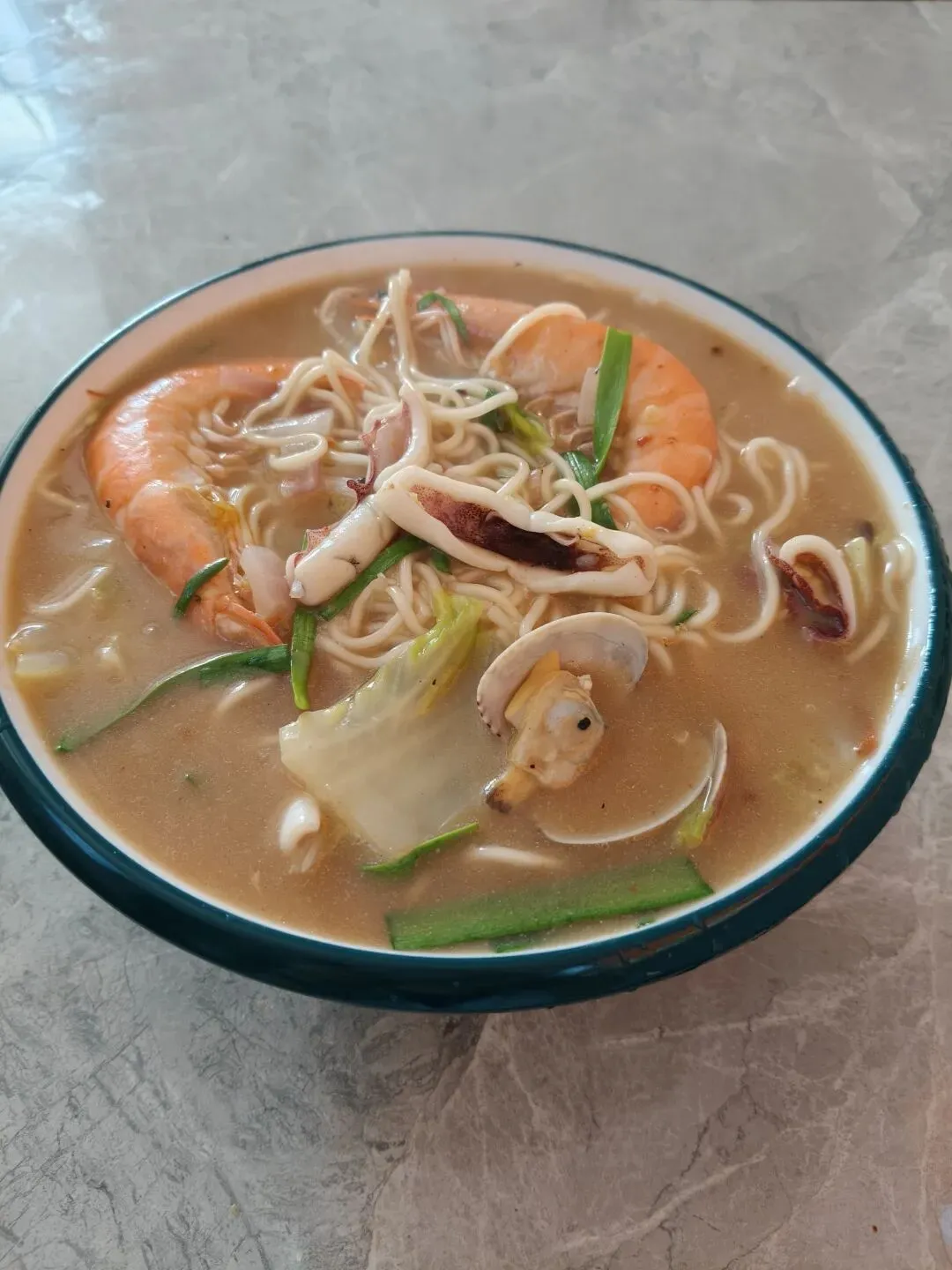 济南的海鲜面分量很大,2个人才能吃完。芝麻味的咸豆腐脑,简直了,太奇怪了!