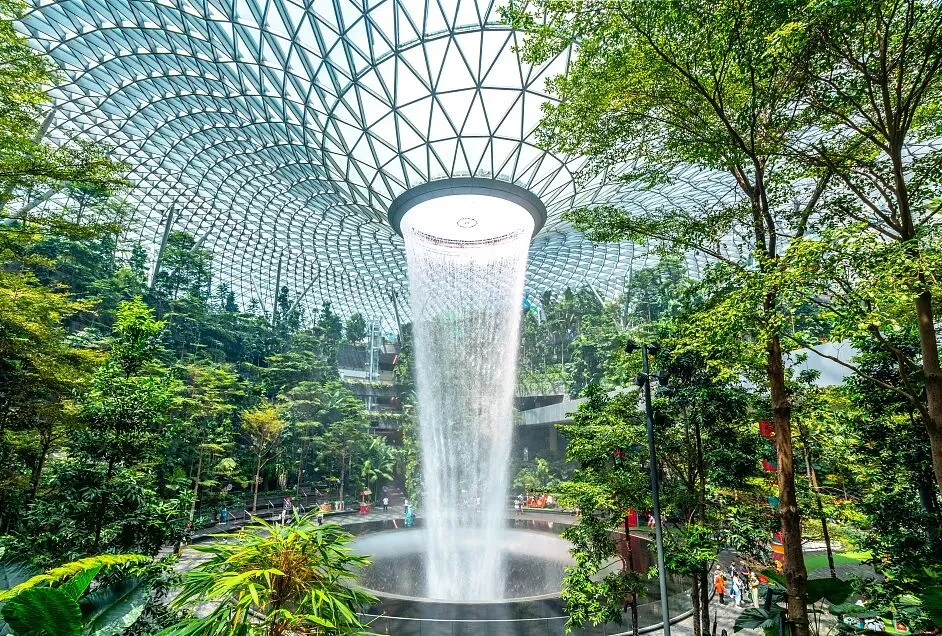 作为全球最大的室内瀑布,星耀樟宜是新加坡樟宜机场的一个亮点。40 米高的室内雨漩涡直冲穹顶,搭配森林谷的万千绿植,将机场化为奇幻花园。这里集购物、餐饮与星空花园游乐于一体,是游客在抵达或离开时必去的地方。