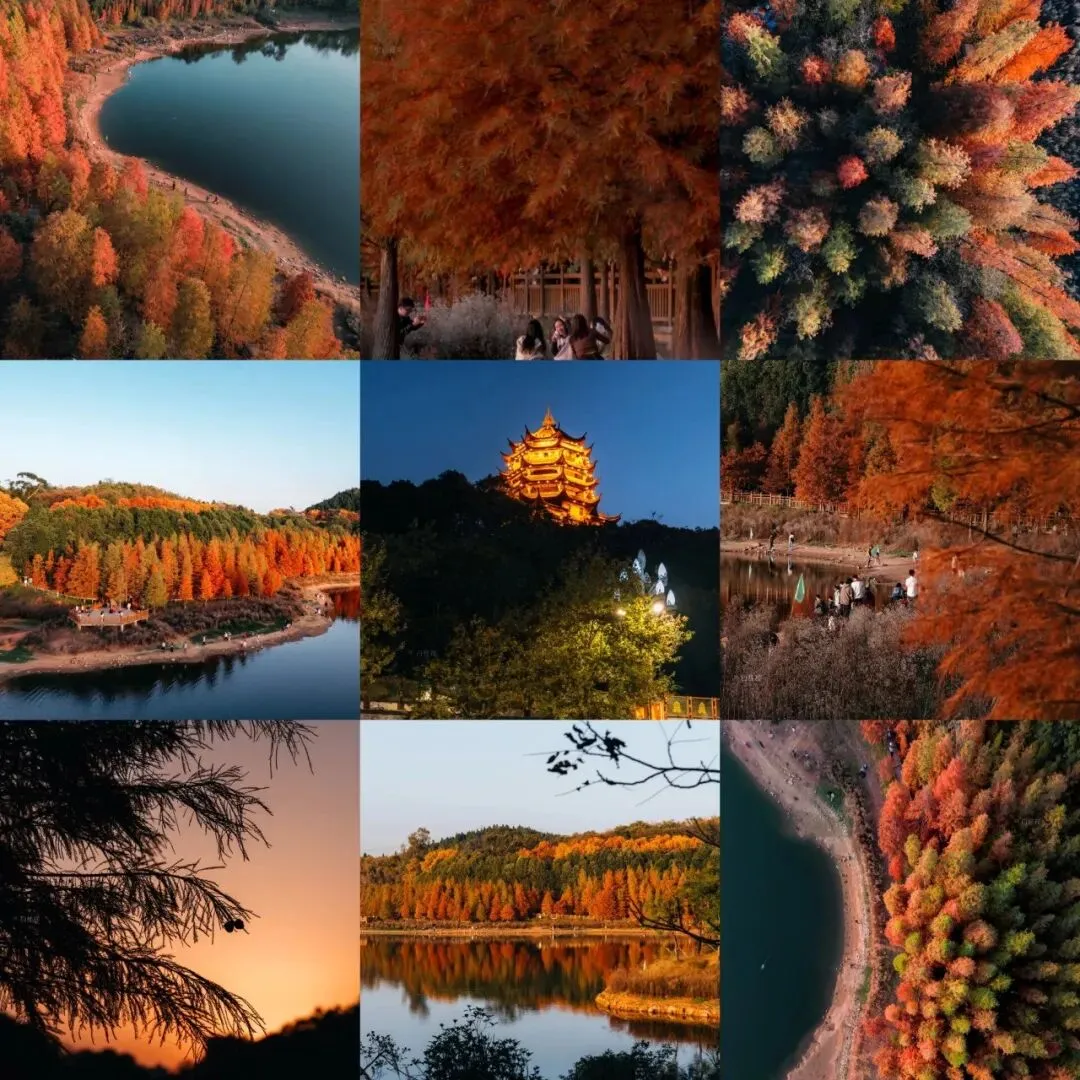 欣赏水杉林的灯光效果,