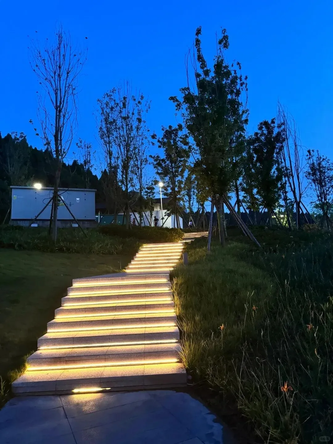 欣赏古桥亮化与草坪小径的光影交错。