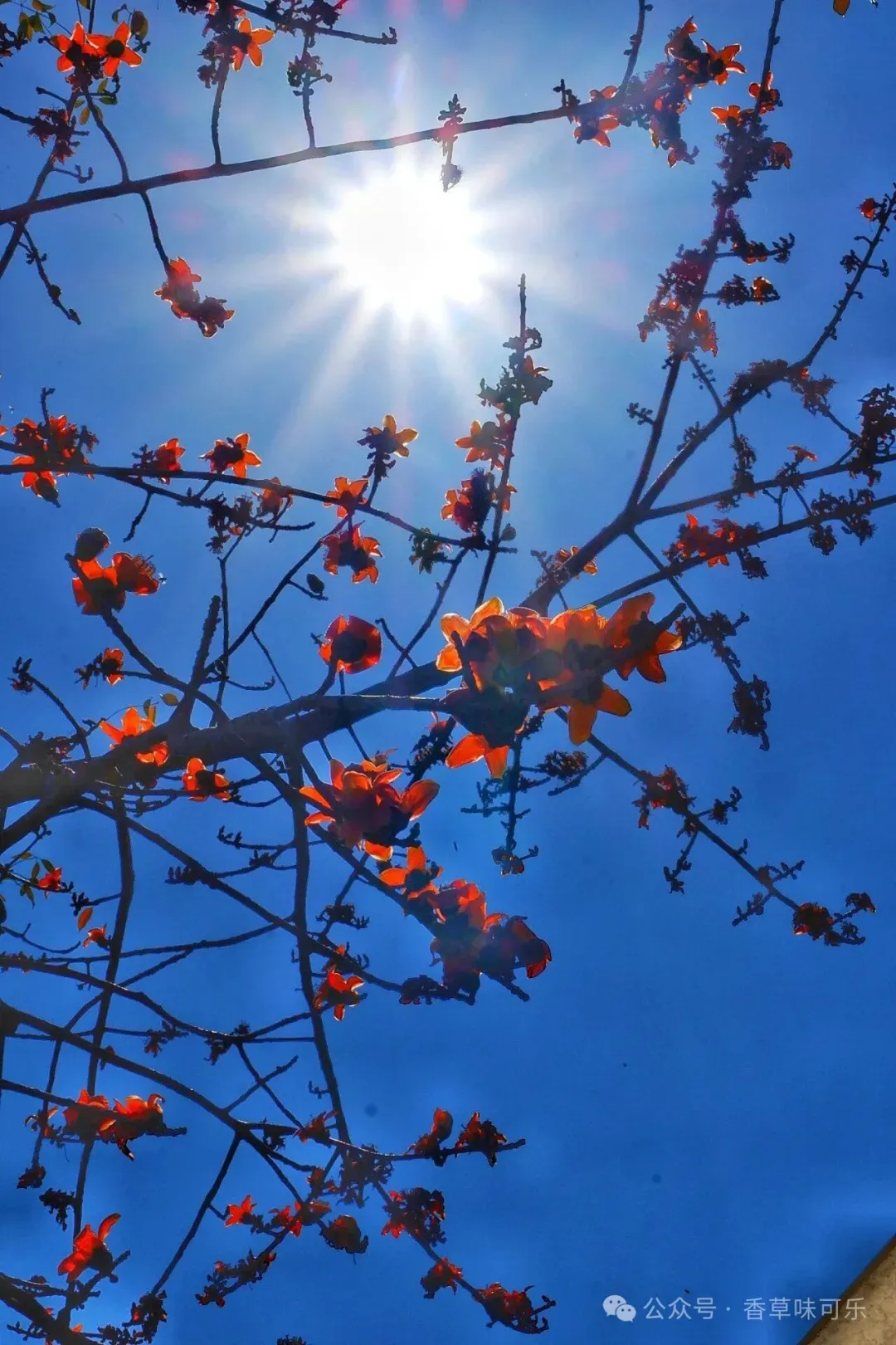 🌲花色红艳似火:木棉花朵硕大,颜色鲜红夺目,盛开时如熊熊火焰如英雄热血,象征着热烈、奉献与不屈的精神。