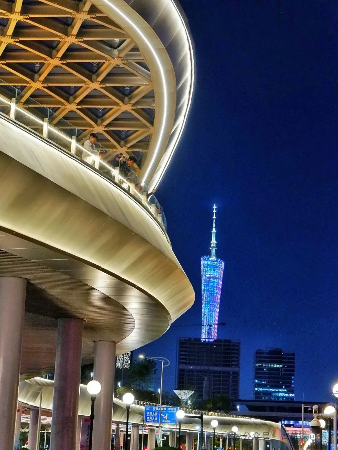 🌙流畅的曲线线条,塑造云涛起伏、碧波荡漾的意象,“珠江之吻”是指平台上一个最大跨度达66米的钢结构穹顶,在灯光映衬下亲吻珠江的姿态,因而得名。