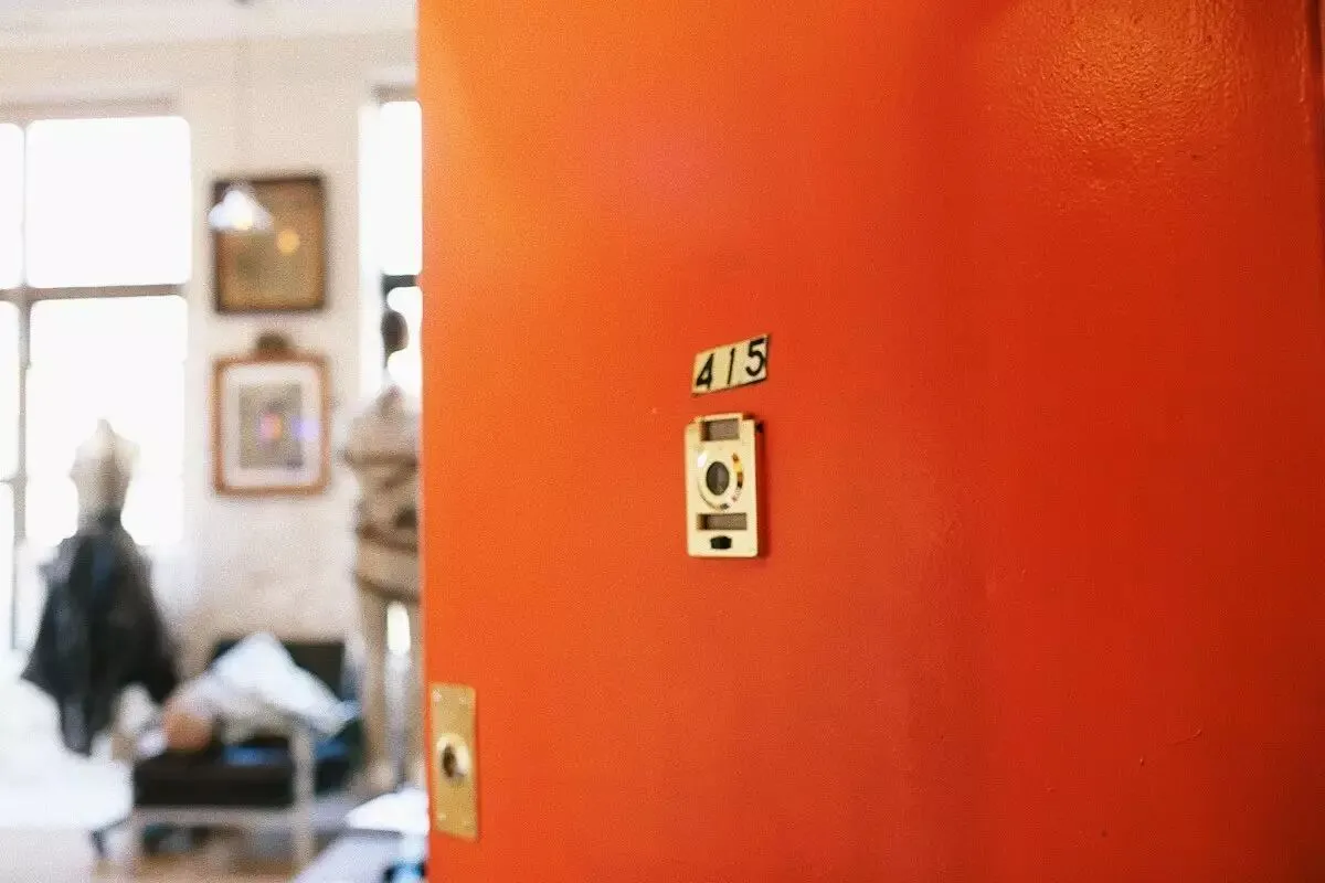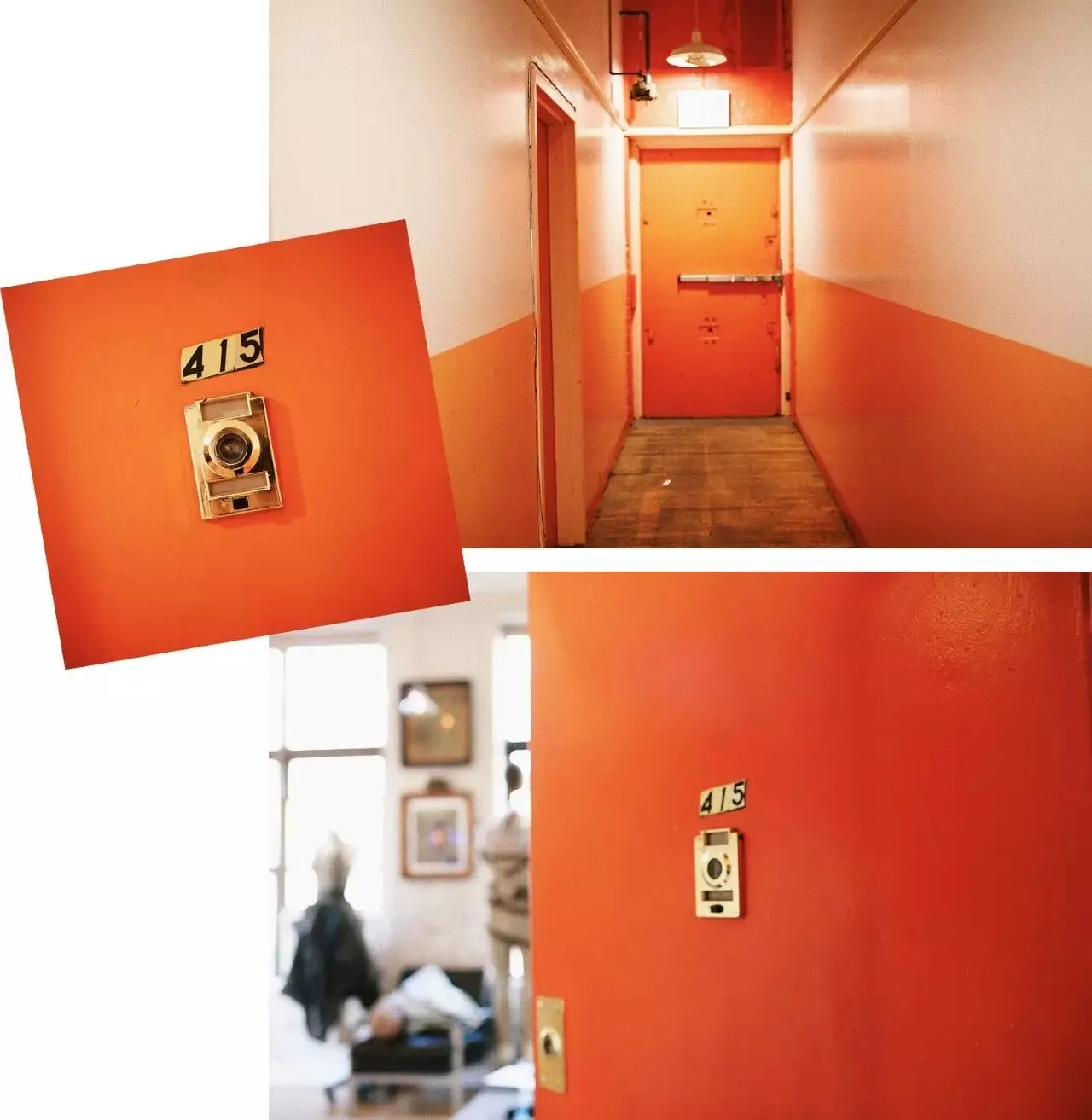公寓楼内部有些像是大size的学校宿舍,每一层的空间主题色都不同,比如一层就是各种深深浅浅的蓝色,而当电梯“叮”到公寓所在的四楼,开门映入眼帘的是混合着各种暖红色的走廊。