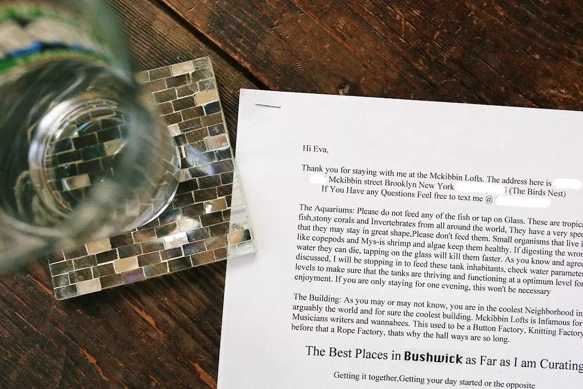 进入自己的房间,在茶几上发现一封以“Hi Eva”开头的信,是Jason整整三页的"私人Bushwick吃喝玩乐攻略":从公寓的历史,到街角好吃的bagels,从咖啡巧克力,到某间pizza店应该点哪一款——🍷✨单是“酒吧和夜店”这一项,他就给出了哪家适合扭蹦跳,哪家live最佳,哪家主打啤酒,哪家又有最好的血腥玛丽等十多种细分。