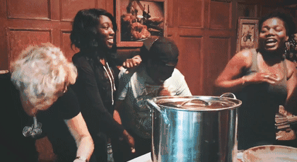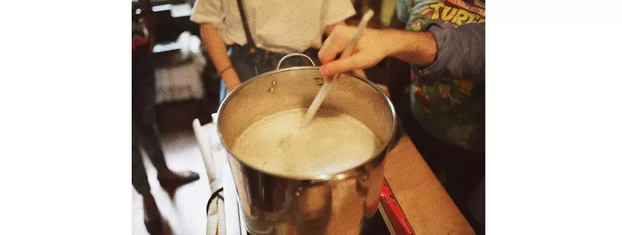 把大家一起碾碎的麦芽放到大锅里煮,