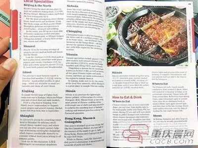 在《中国》分册旅行中国的推荐线路中,首先就有为期四周的“长江之旅”。作为这趟旅行的重要行程之一,书中对重庆的形容是:“辣的故乡,三峡门户,有火辣辣的重庆火锅。”