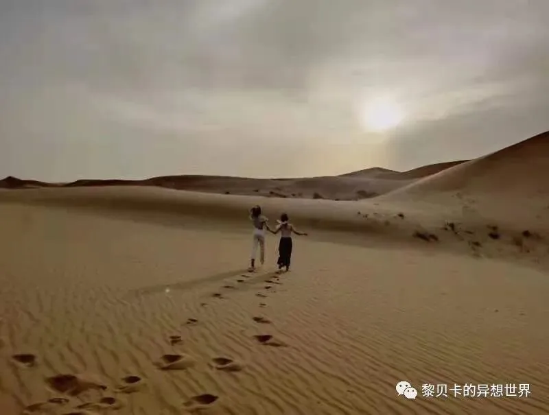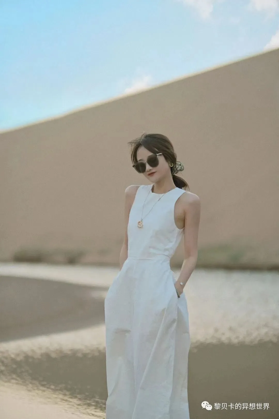 沙漠和白色单品很配,墨镜丝巾是加分项