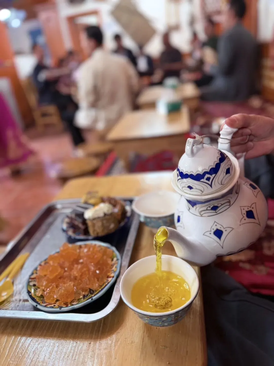 导航“老城角落百年茶馆”,15元一壶玫瑰茶,配5元一个的烤包子,坐在雕花木窗边看行人穿梭。二楼靠窗位必抢!能俯瞰街巷烟火,听热瓦普琴声悠悠,恍惚间穿越回百年前。