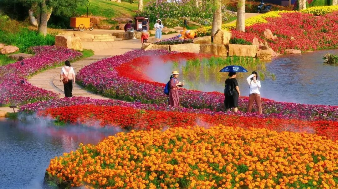 叶子花园里,玫红热情绽放,白色建筑点缀其间。丘石花园则以多种鲜花织成烂漫花境。夕阳西斜时,花海被镀上一层金边,是拍照的黄金时段。