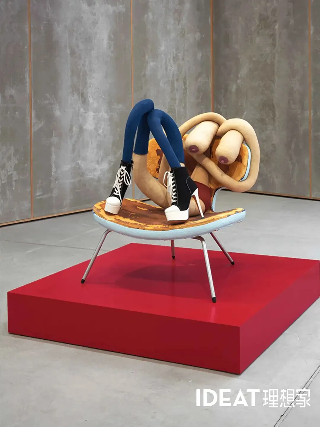 ▲ 1988 年,“英国青年艺术家”群体策划了“冰冻”艺术展(Freeze),展出了Damien Hirst、Tracey Emin、Sarah Lucas 等人的作品。其中,Sarah Lucas 的作品撼动了女艺术家经典作品的法则。图中这件作品摄于 Sadie Coles 艺廊,当时正在参加“Honey Pie”艺术展。
