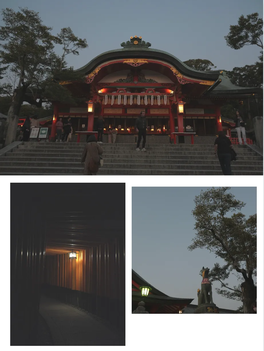最有名的是由数百个鸟居组成,通往山顶的“千本鸟居”步道。宁静幽深的山林里,鸟雀的鸣叫声偶有响起,沿着石阶步道慢慢走上山,目之所及一片绚烂夺目的红色,恍若踏入了神圣的神明之地。怀着一颗虔诚的心去祭拜一下,说不定会有好事发生呢。