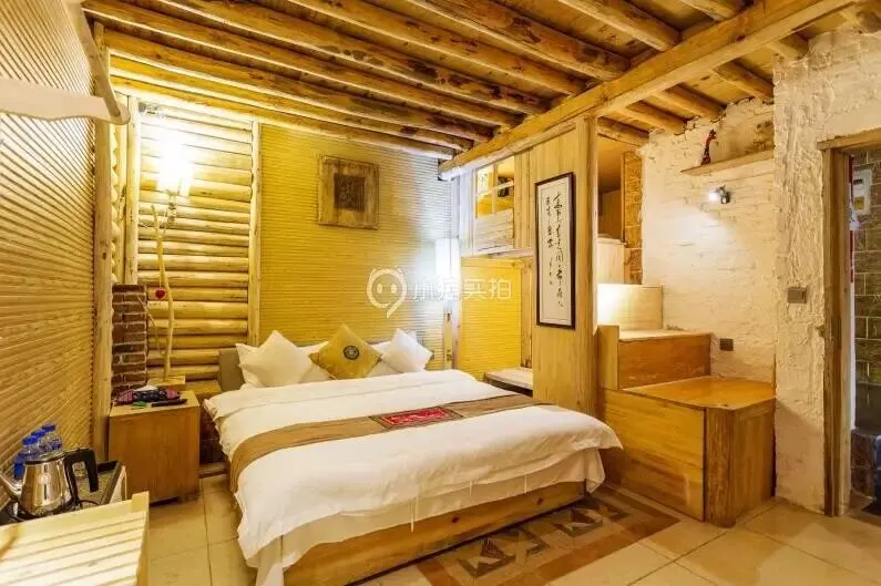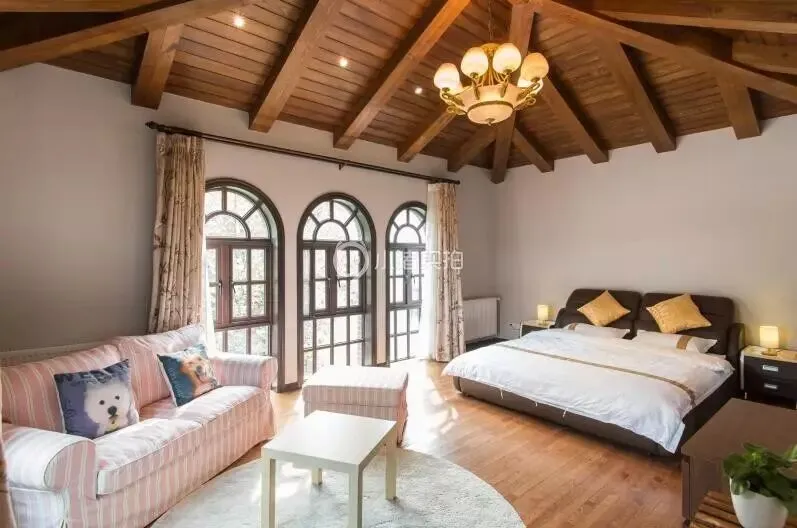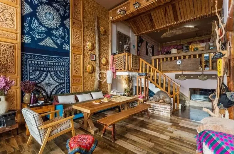 全木头的屋子,手绘+扎染+原木+民俗的元素,将房间装饰的格外文艺。这里常备鲜花,有着独立的阁楼间和读书角, 小小的木头窗户外有一盏来自土耳其的彩色玻璃吊灯,整个房间都是自然的清香。