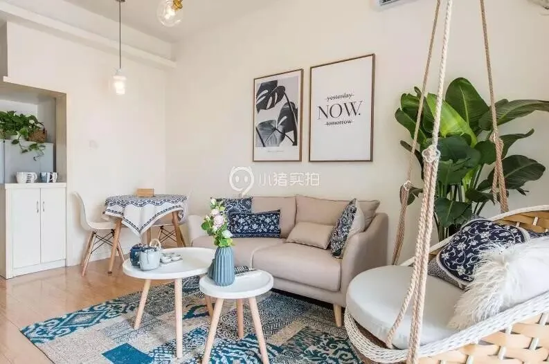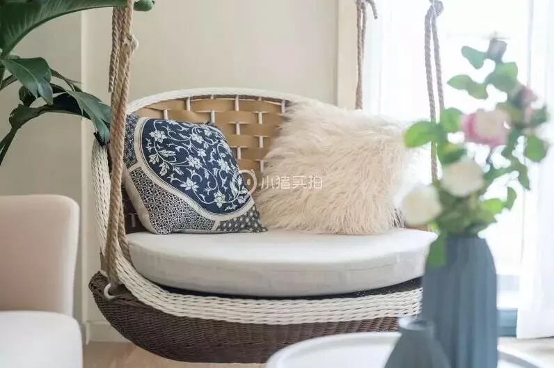 整体清新的北欧风搭配上民族风元素也是毫无违和感,客厅超大的吊篮简直是妹子的心头爱,我猜,你也会一眼喜欢上的吧?