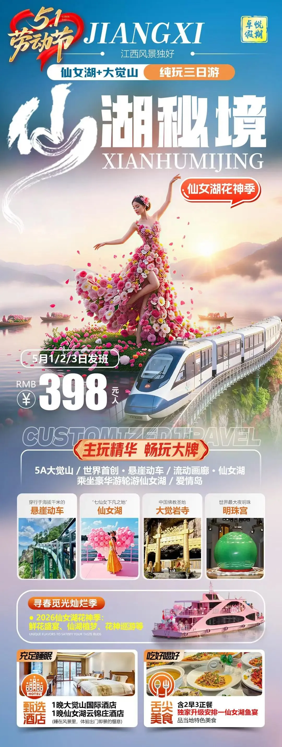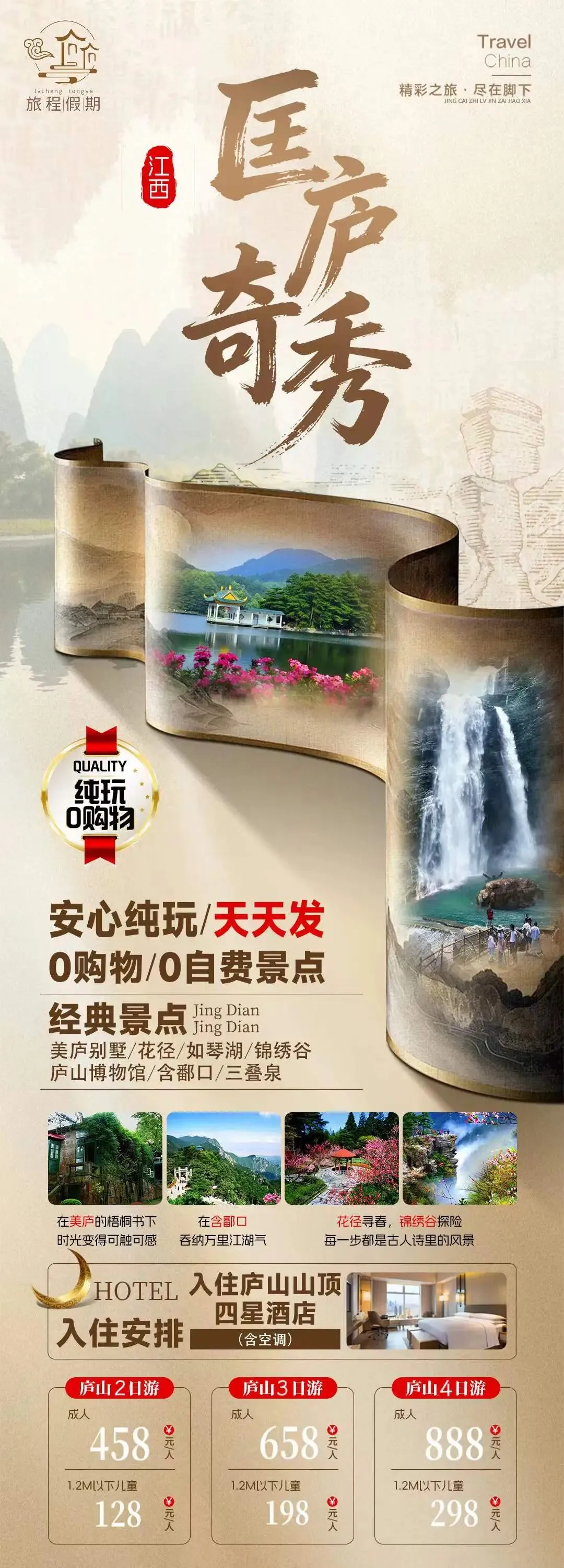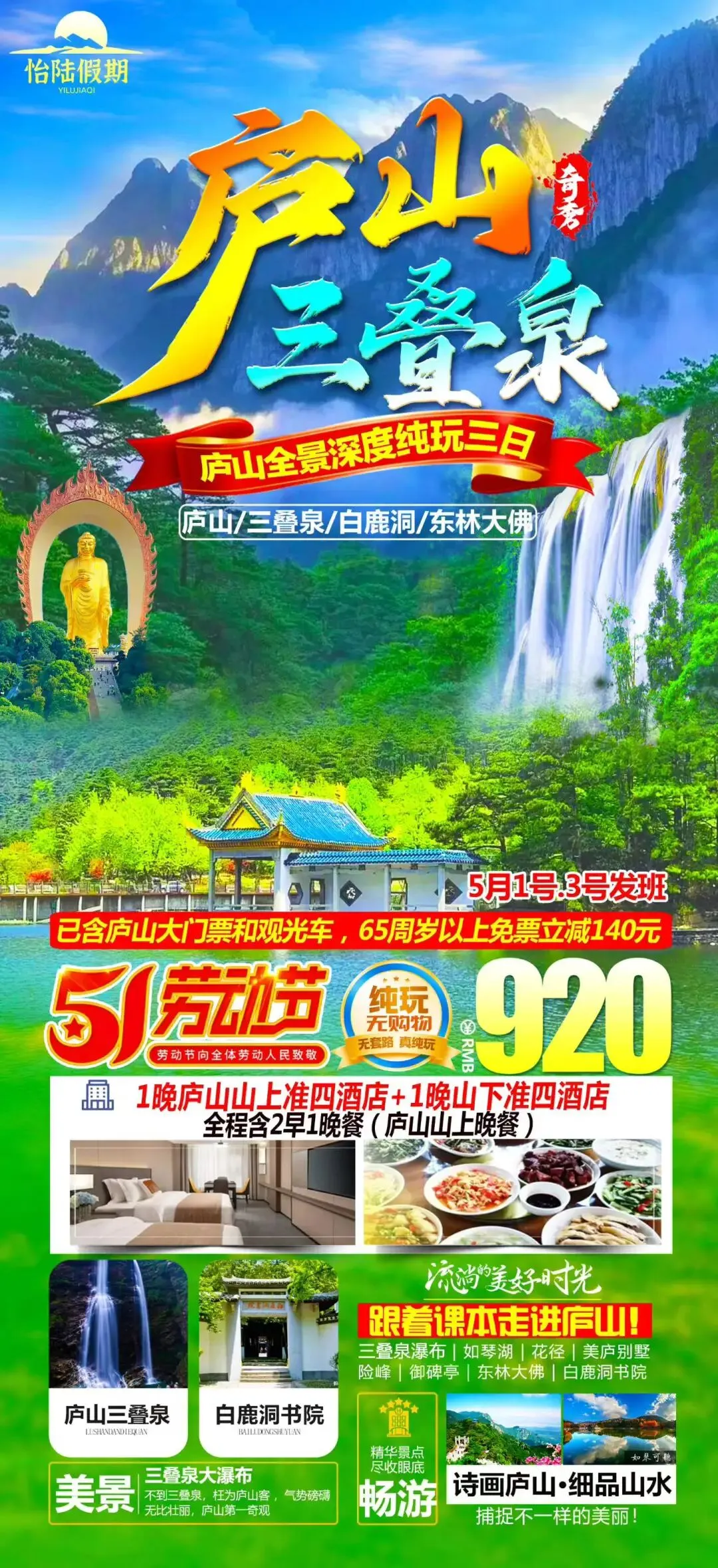 6、五一庐山动车:庐山2天:458元/人,五一+50元/人;庐山3天:658元/人,五一+250元/人;庐山4天:888元/人,五一+350元/人