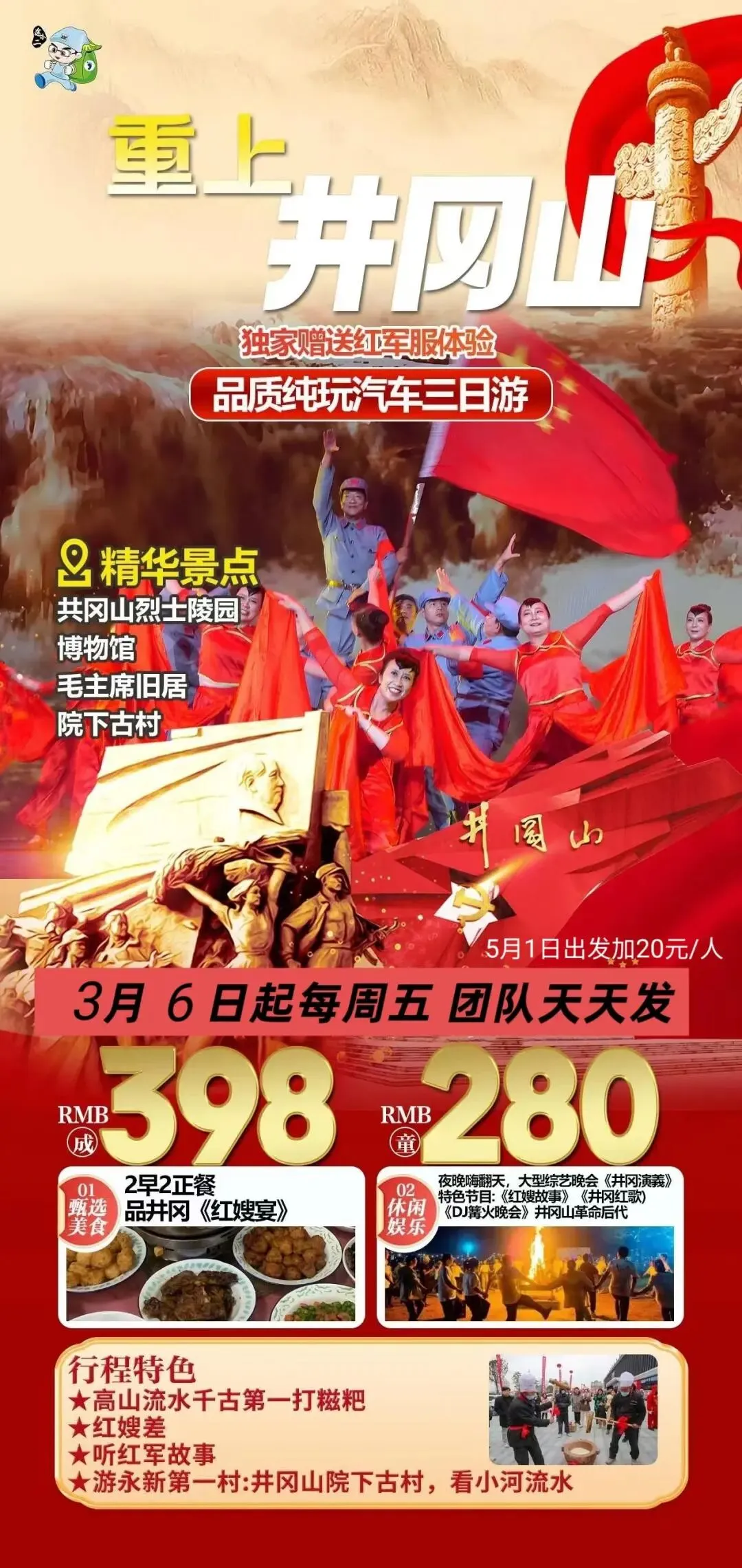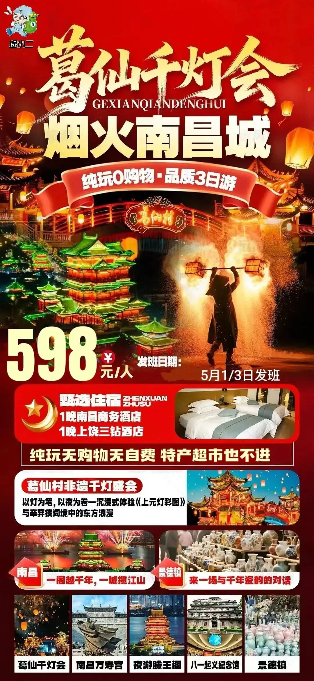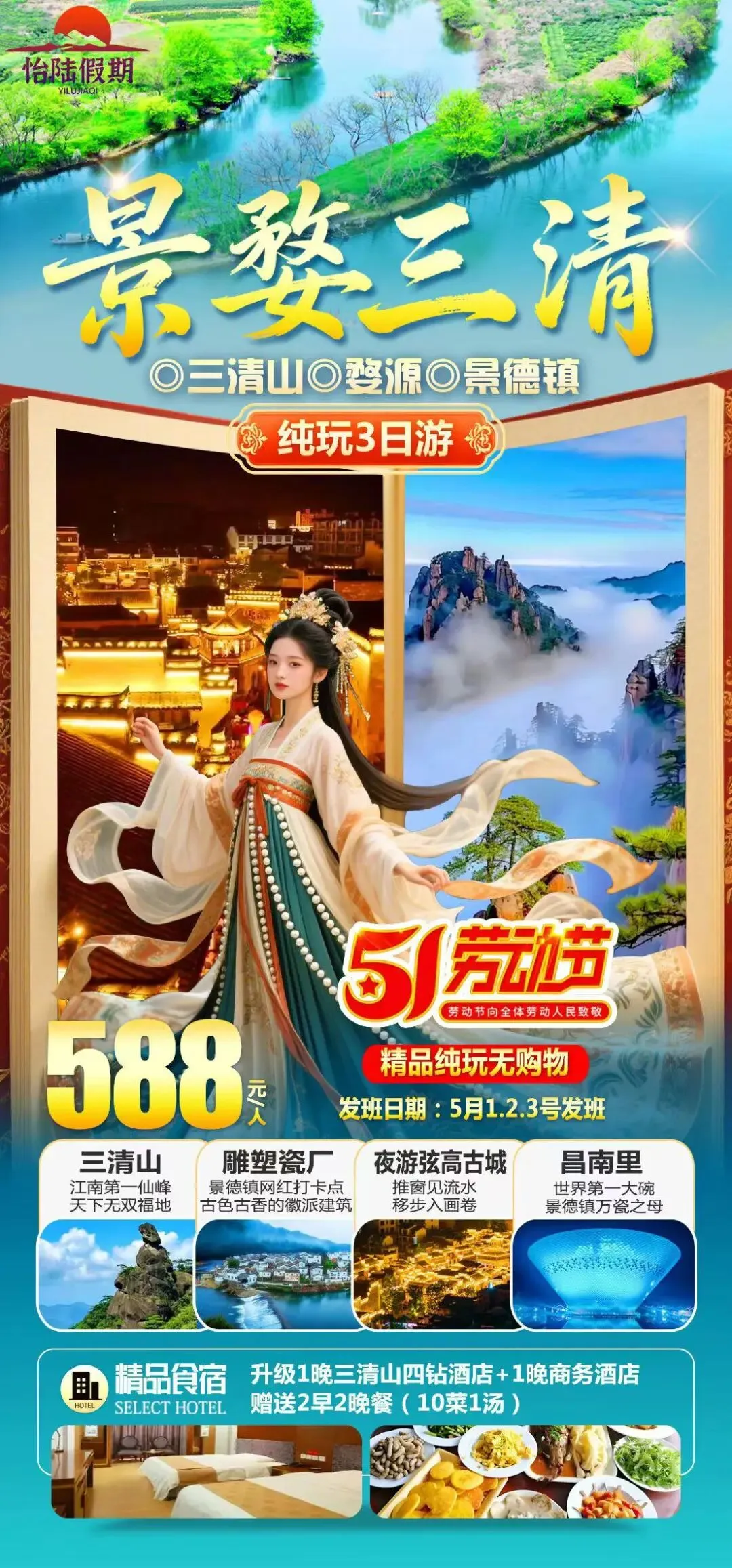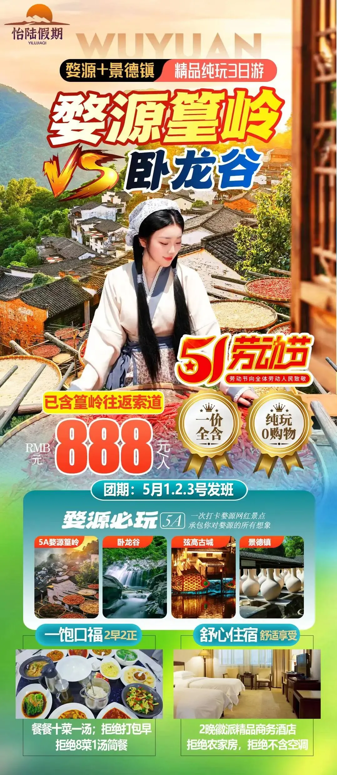 6、五一庐山动车:庐山2天:458元/人,五一+50元/人;庐山3天:658元/人,五一+250元/人;庐山4天:888元/人,五一+350元/人