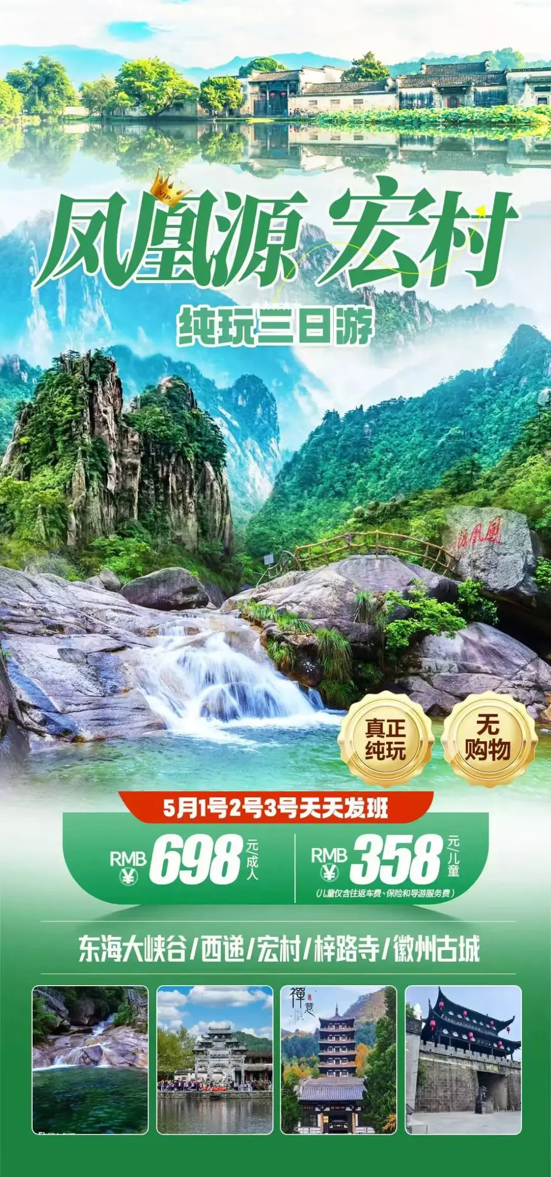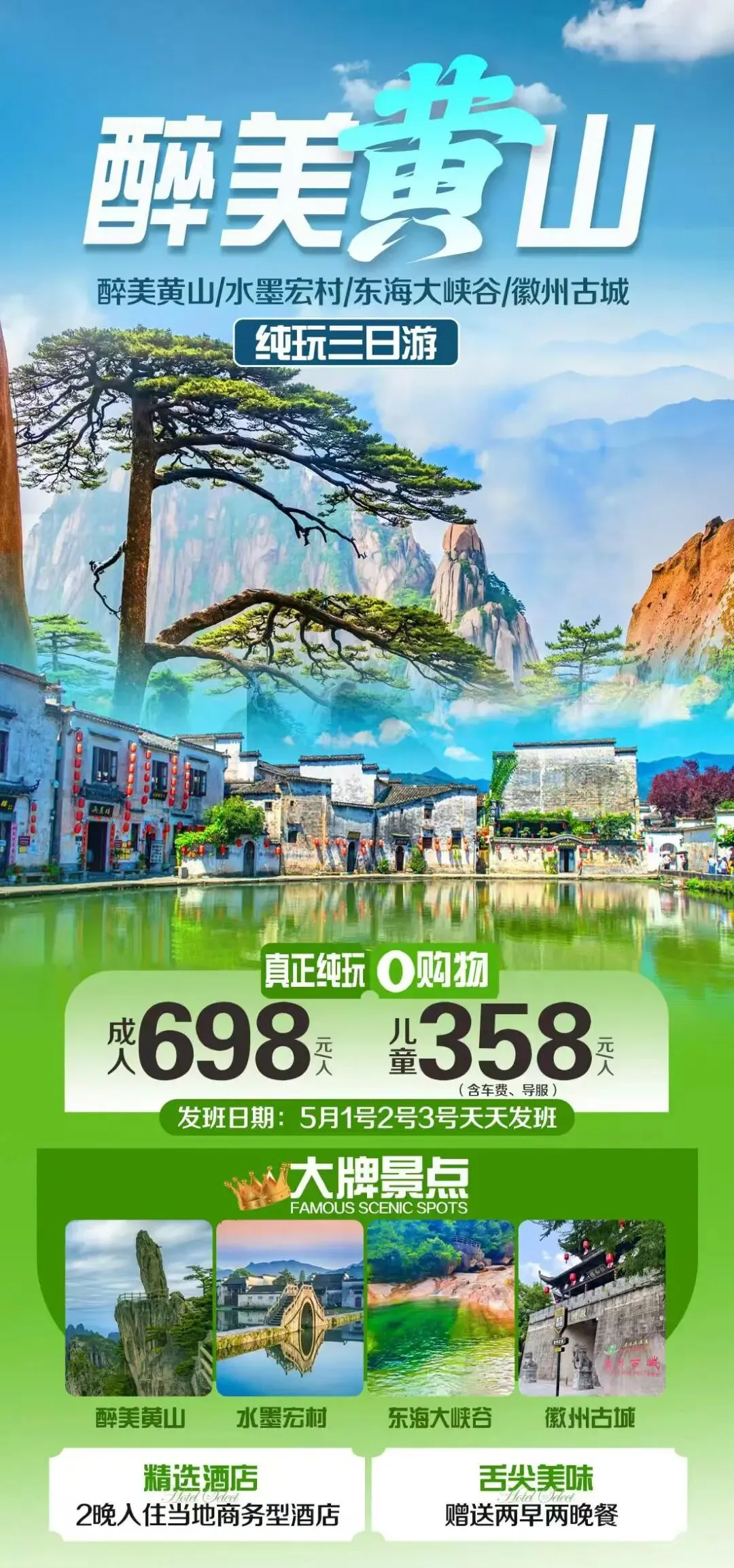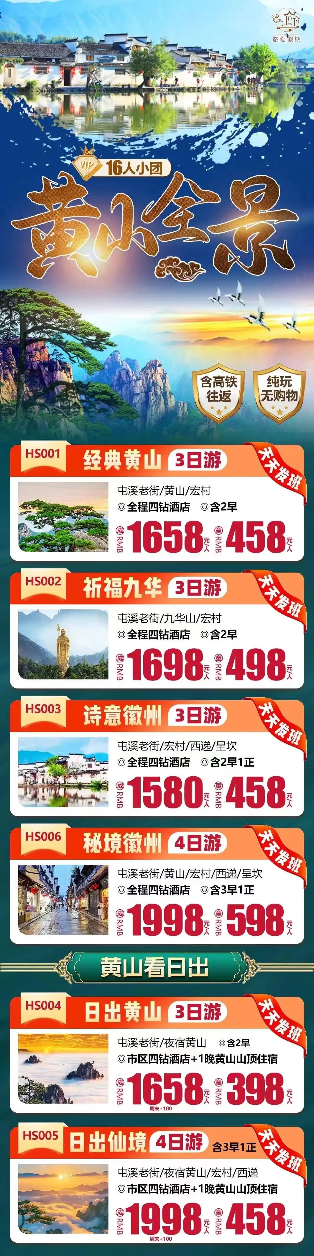 5、黄山九华山西递宏村:五一出发3天+600,4天+800;🏨市区全程携程四钻;💎VIP16人精品小团💎高铁往返,含门票免票现退