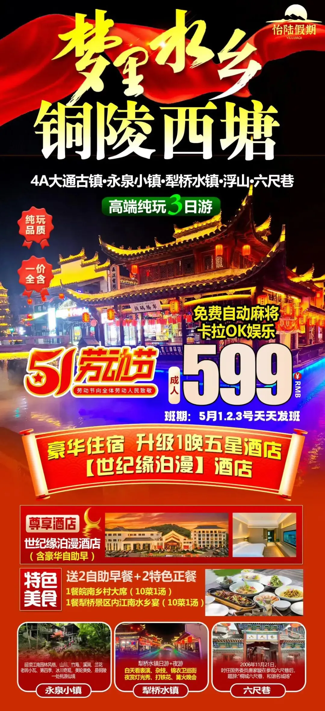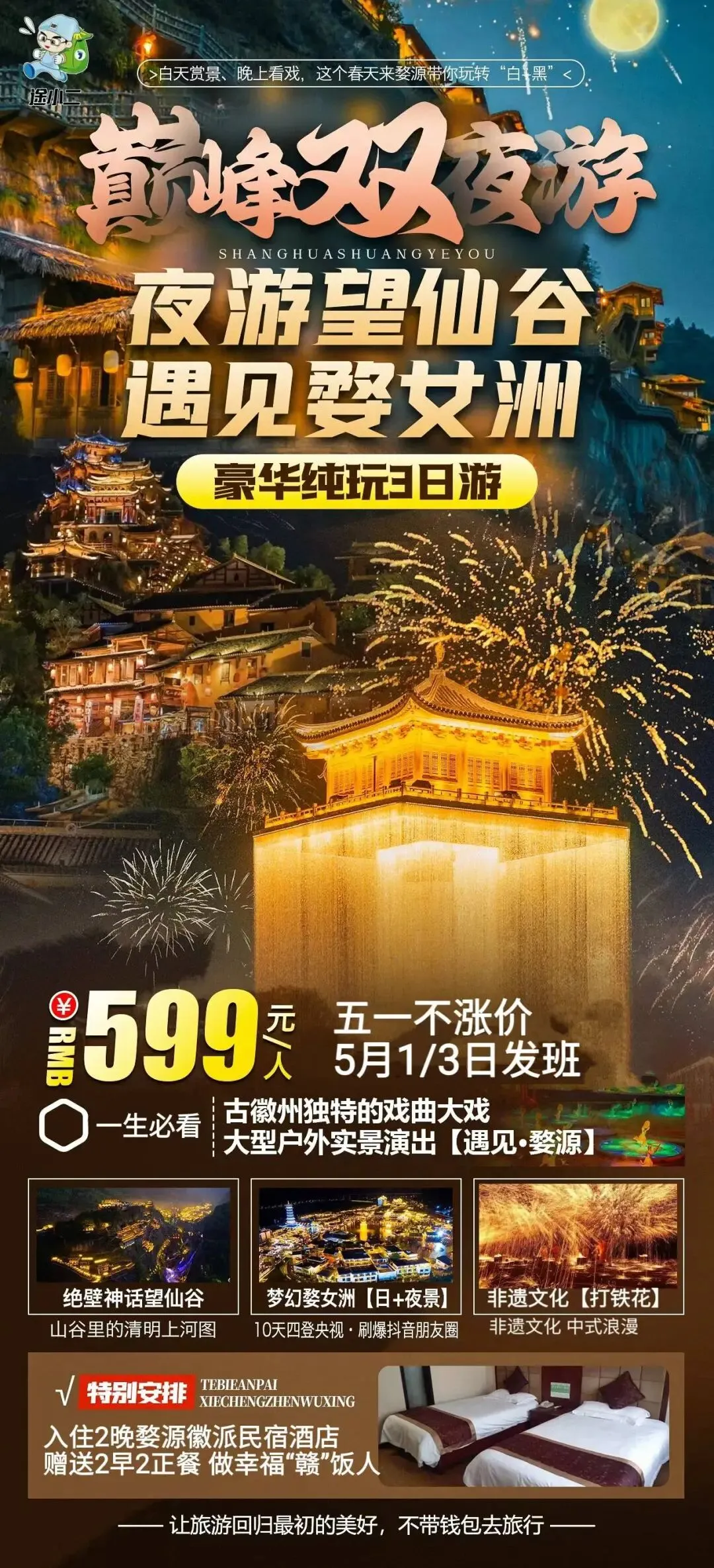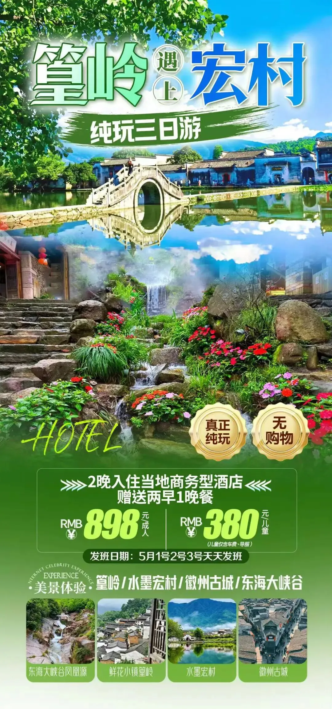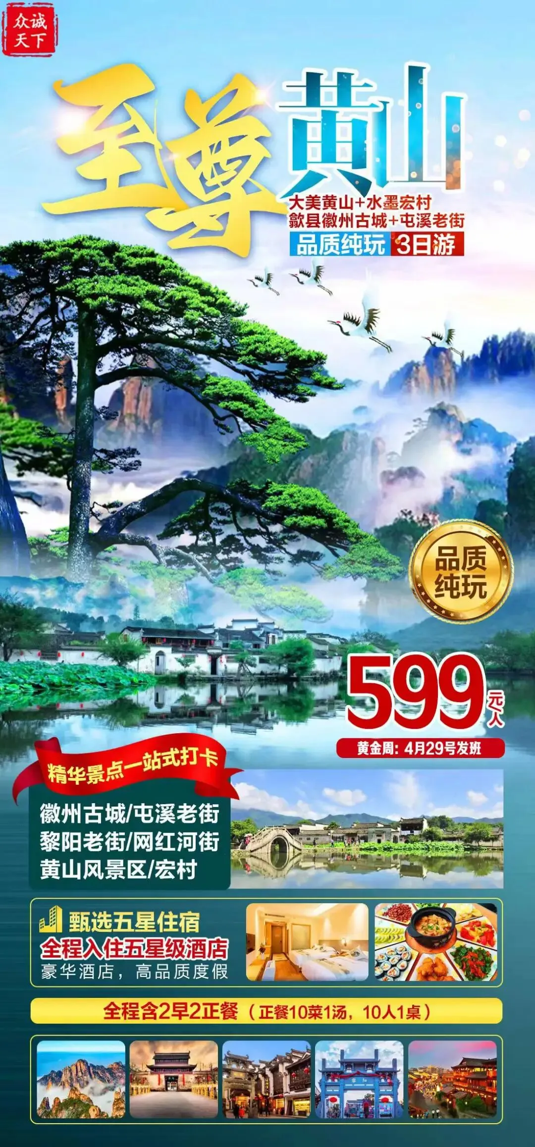 5、黄山九华山西递宏村:五一出发3天+600,4天+800;🏨市区全程携程四钻;💎VIP16人精品小团💎高铁往返,含门票免票现退